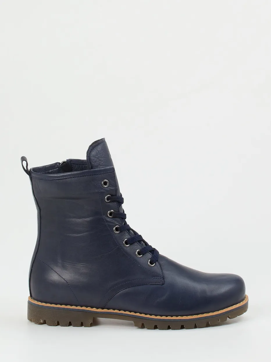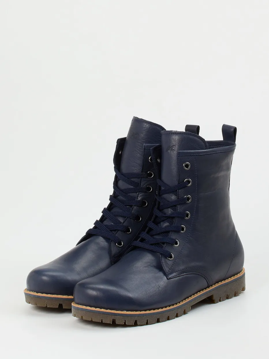 Die dunkelblauen Schnürboots vereinen robuste Utility-Details mit einem angenehm weichen Kalbleder – ideal für komfortorientierte Alltagslooks.