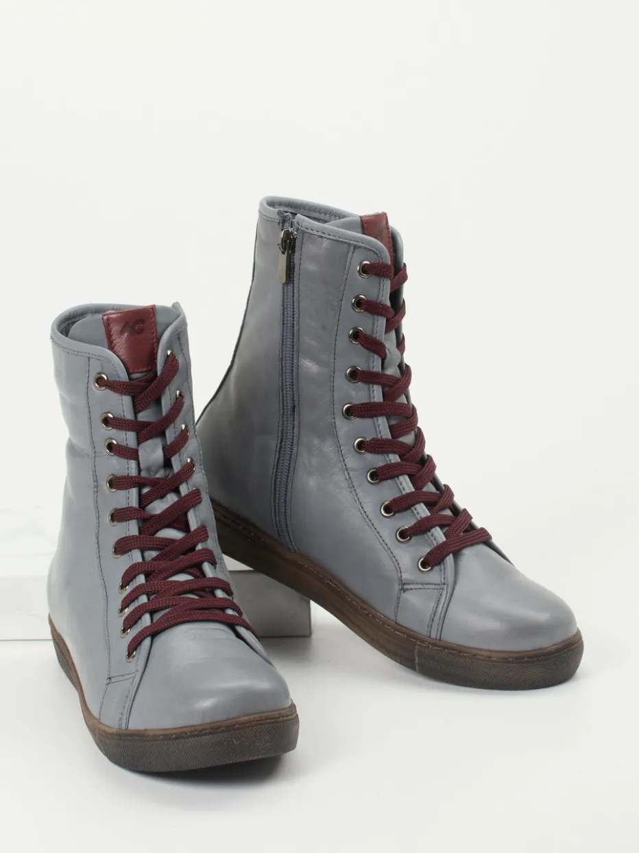 Ideal für entspannte City-Tage oder Spaziergänge bei kühlem Wetter: Das stahlgraue Kalbleder mit matter Oberfläche bietet eine samtig-weiche Haptik und ist gleichzeitig strapazierfähig. Bordeauxfarbene Details an Zunge und Schnürsenkeln setzen modische Kontraste, während der seitliche Reißverschluss schnelles An- und Ausziehen ermöglicht. Die Vintage-Gummisohle mit rutschhemmendem Profil verstärkt den Retro-Charakter und sorgt für gute Traktion. In ihrer schlanken, knöchelhohen Form wirken die Boots lässig—perfekt zu Oversize-Strick und Jeans.