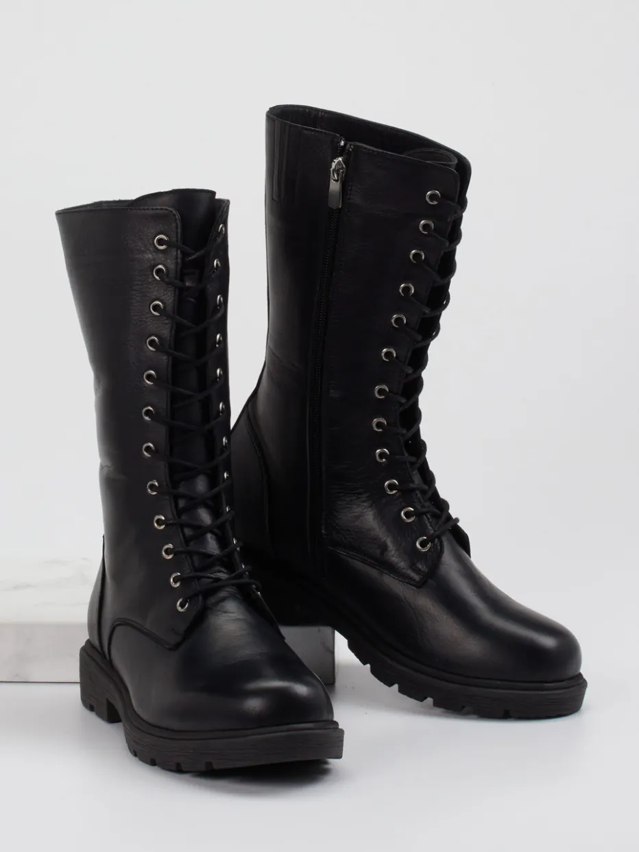 Markant & minimalistisch für den Alltag.Andrea Conti präsentiert mit diesem Schnürstiefel ein stilvolles Basic für die Herbst-/Wintersaison. Für vielfältige Alltagswege bietet der schwarze Stiefel aus matt verarbeitetem Kalbleder einen robusten und zugleich schlichten Look. die klassische, schmale Passform mit mittelhohem Schaft wird durch die silberfarbenen Metallösen und die dezente Schnürung betont. Ein zusätzlicher Innenreißverschluss erleichtert das An- und Ausziehen, während die stark profilierte Gummisohle sicheren Grip bietet. Als Teil des Combat Boot Revivals wirkt das Modell gleichzeitig funktional und trendbewusst. Besonders wirkungsvoll zu Strickkleidern oder Lederjacken. Ein komfortabler Begleiter mit urbaner Haltung aus dem Hause Andrea Conti.