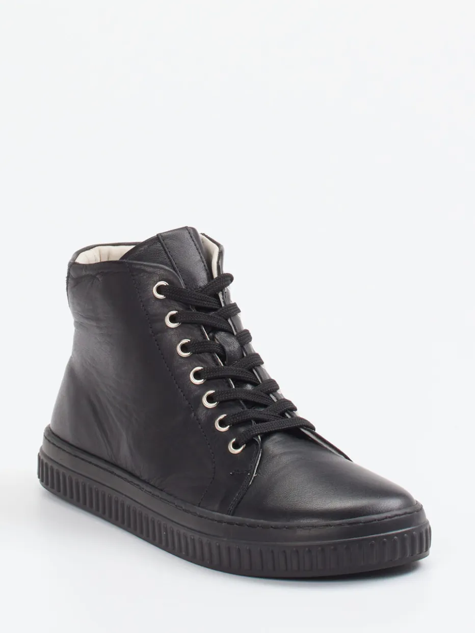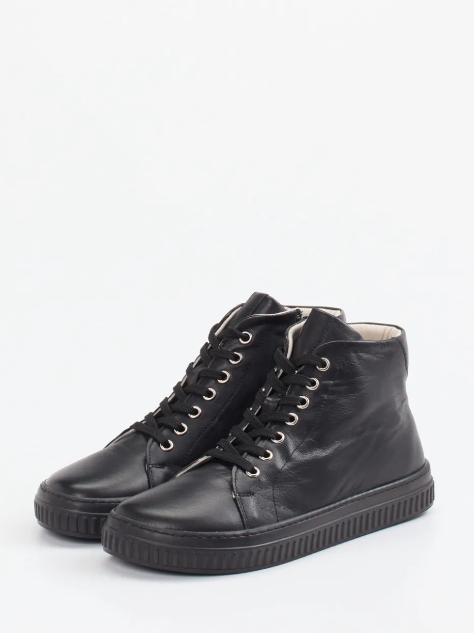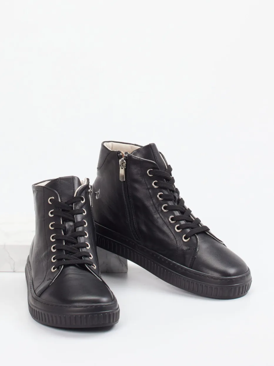 Minimalismus trifft Funktionalität.Andrea Conti präsentiert mit dieser knöchelhohen Schnürstiefelette einen puristischen Damen-Sneaker für Alltag und Büro. Die zeitlose schwarze Optik mit matter Kalbleder-Oberfläche und silberfarbenen Ösen passt ideal zu urbanen Looks. Schnürung und seitlicher Reißverschluss bieten hohen Komfort beim An- und Ausziehen. Die profilierte Gummisohle sorgt für sicheren Grip auf verschiedensten Untergründen, während das gepolsterte Textilfutter angenehmen Halt gibt. Die klare Linienführung unterstreicht den minimalistischen Streetwear-Charakter – ein urbaner Clean Look in perfekter Balance. Ein stilsicherer Begleiter mit bequemer Passform und durchdachter Funktionalität.