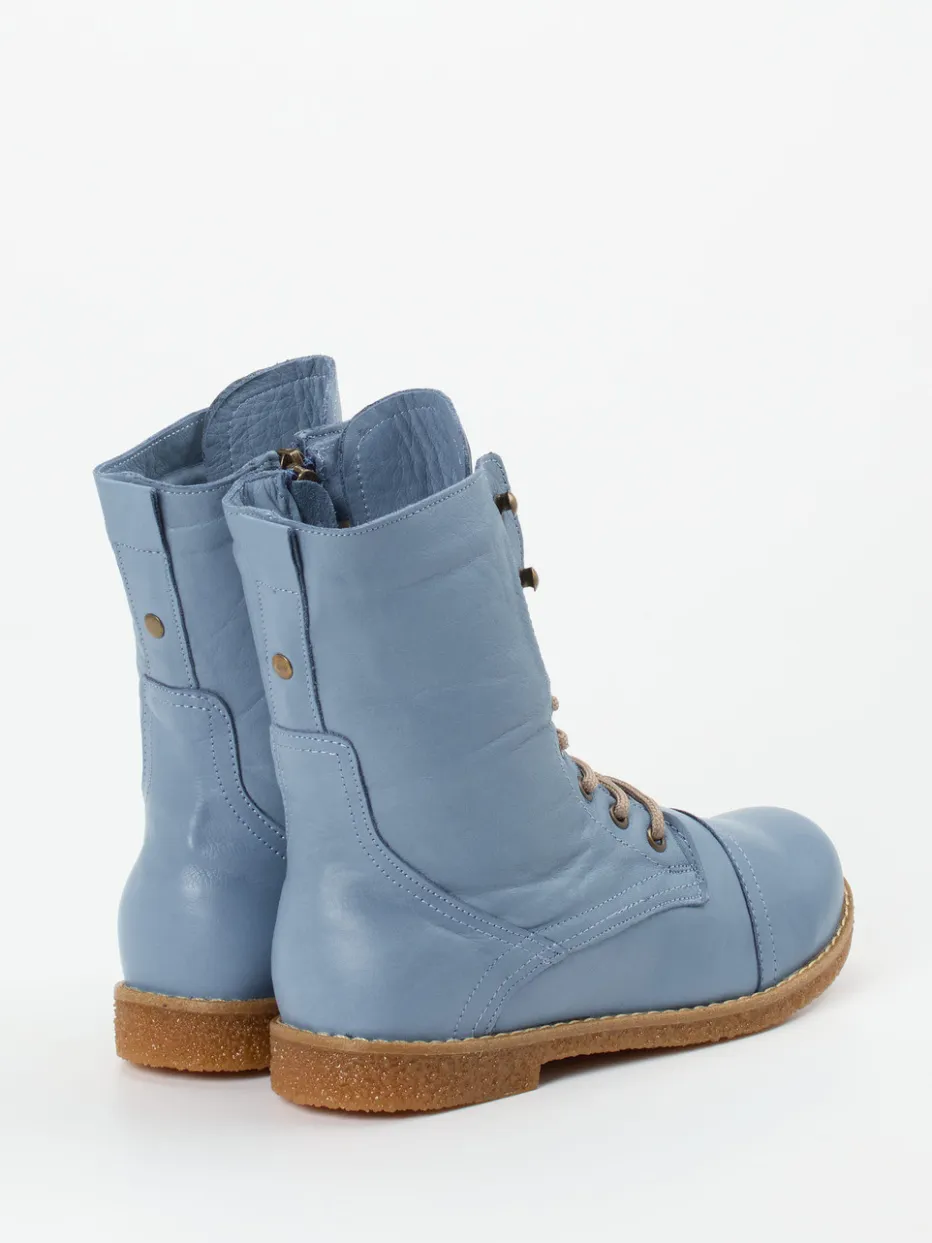 Diese taubenblaue Stiefelette aus mattiertem Kalbleder kombiniert Komfort mit aktuellen Utility-Details. Ideal für entspannte Freizeitlooks mit stilvoller Note.