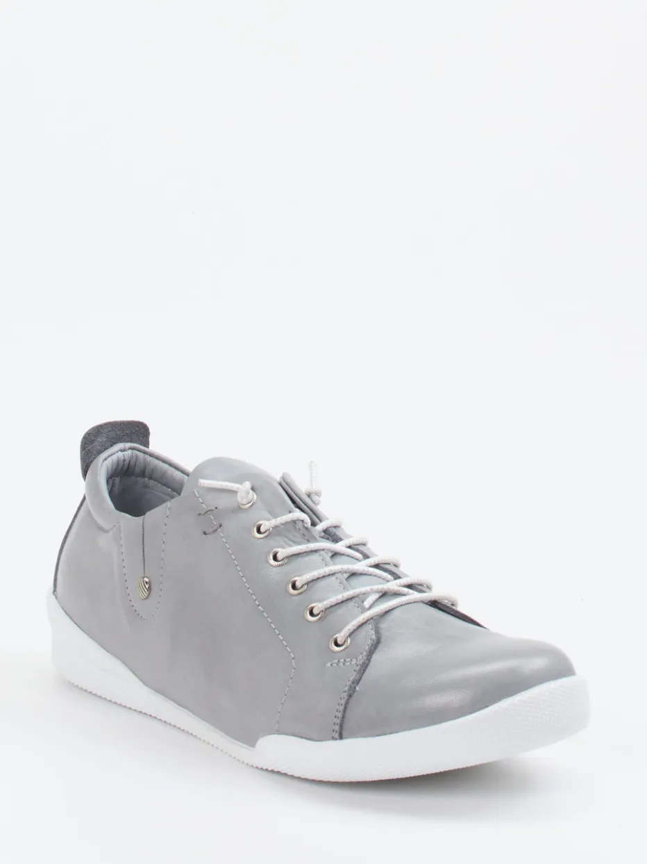 Silberne Leichtigkeit mit Komfortanspruch.Andrea Conti präsentiert mit diesem Damen-Sneaker ein Modell für Alltag und Freizeit. Das silberfarbene Kalbleder zeigt sich matt und weich, mit glatter Oberfläche und dezenter Farbwirkung. Die klassische, niedrig geschnittene Silhouette wird durch eine weiße Gummisohle und kontrastierende Schnürung mit glitzernden Elementen aufgelockert. Der weich gepolsterte Einstieg und das herausnehmbare, lederbezogene Fußbett bieten angenehmen Tragekomfort – auch für eigene Einlagen geeignet. Der Look fügt sich nahtlos in minimalistische Casualstyles ein. Ein durchdachter Begleiter für entspannte Momente mit dezenter Stilwirkung.