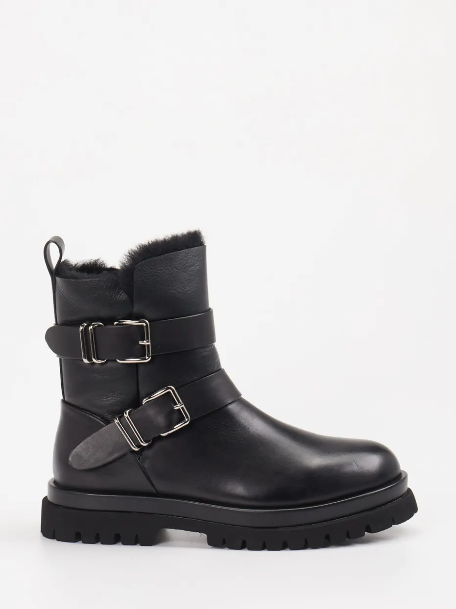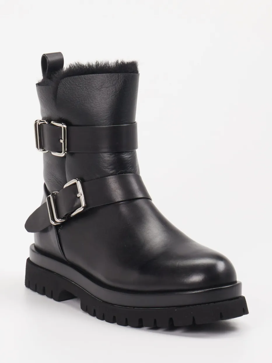 Winterfest mit Stil. Andrea Puccini präsentiert eine derbe Biker-Stiefelette für Damen. Für kalte Tage in der Stadt oder beim Spaziergang im Park bietet diese Stiefelette zuverlässige Wärme dank kuscheligem Lammfellfutter. Sie ist aus schwarzem Lammleder gefertigt, das mit glatter, glänzender Oberfläche überzeugt. Zwei silberfarbene Schnallen setzen markante Akzente, während ein Innenreißverschluss das Anziehen erleichtert. Die klassische Silhouette trifft auf eine rutschfeste Gummisohle mit robustem Profil – praktische Utility-Ästhetik im Trendformat. Ein sichtbares Kunstfellfutter am Schaftrand und eine rückseitige Zuglasche runden den Look ab. Besonders gut kombinierbar mit Steppjacke und Crossbody-Bag. Ein Modell, das Komfort mit urbaner Coolness vereint.