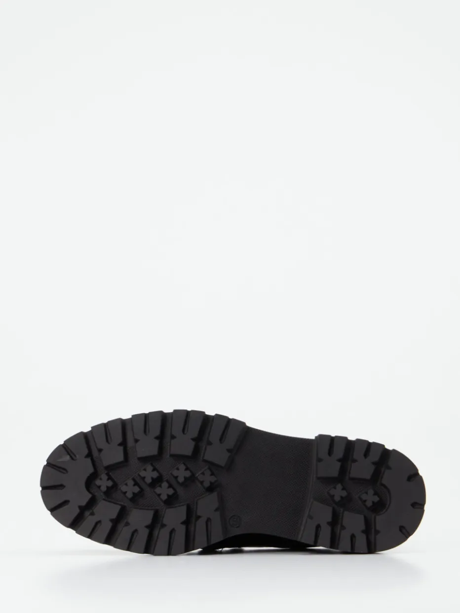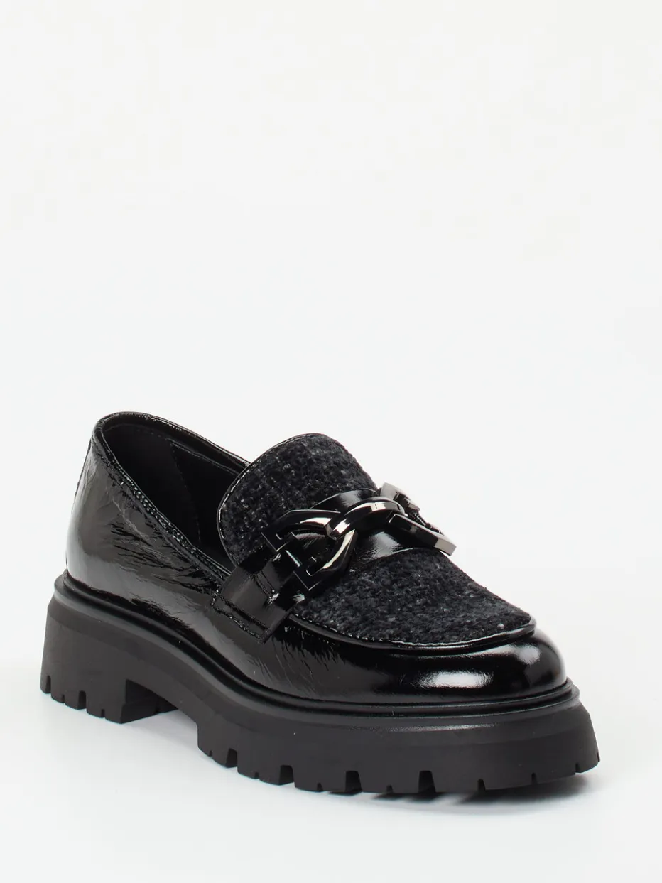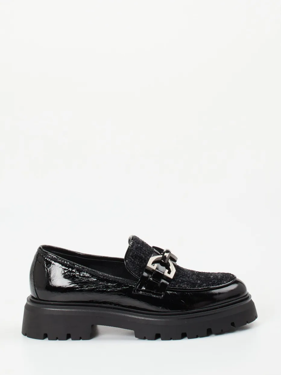 Ideal für stilbewusste Tage in der Stadt vereint der Chunky-Loafer schwarzes Lackleder mit samtartig strukturiertem Wollfilz auf dem Blatt. Die klassische Silhouette mit seitlichen Einkerbungen sorgt für einen komfortablen Einstieg, während die auffällige Gliederkette in silberfarbener Metalloptik einen eleganten Kontrast bietet. Die voluminöse Plateau-Gummisohle mit markantem Profil gewährleistet Trittsicherheit und liegt voll im Materialmix- und Chunky-Trend für Herbst/Winter. Perfekte Ergänzung zu Oversized-Blazer und Crossbody-Bag.