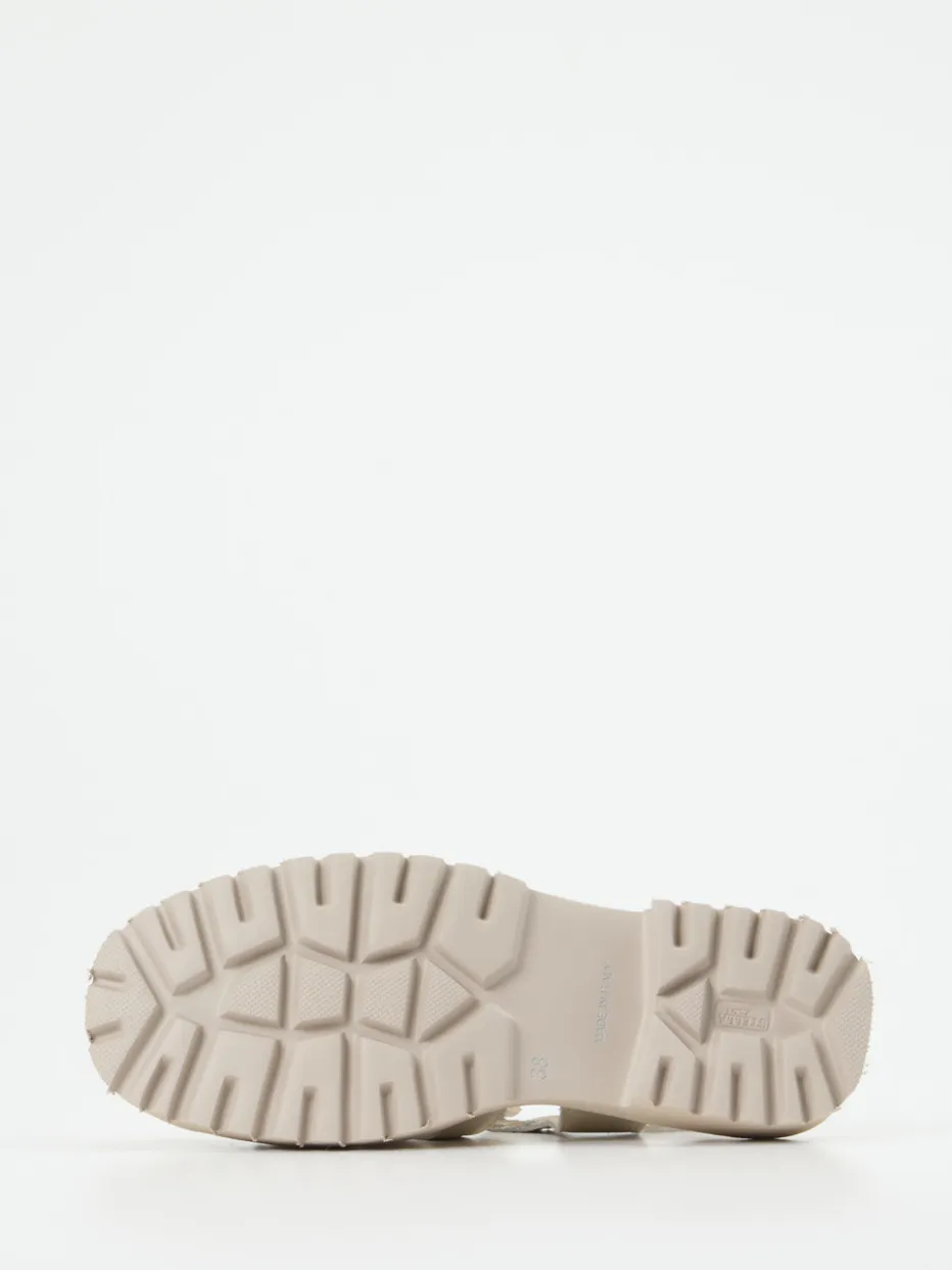 Chunky trifft Quiet Luxury.Die Marke Andrea Puccini interpretiert die klassische Fischersandale neu. In Alltag und Urlaub sorgt das cremeweiße Modell für einen stilvollen Auftritt mit unaufdringlicher Präsenz. Das feinmatte Lammleder zeigt sich geschmeidig verarbeitet, die geschlossene Vorderpartie mit Flechtakzenten unterstreicht den dezenten Streetwear-Einfluss. Eine goldfarbene Metallschnalle bietet individuelle Anpassung, während die profilierte Leichtzellssohle Trittsicherheit garantiert. Farblich abgestimmte Nähte und ein gepolstertes Fußbett runden den Komfort ab. Optimal kombinierbar mit Leinen, Beige- oder Sandtönen. Ein femininer Stilbaustein mit italienischer Leichtigkeit und modischem Selbstverständnis.
