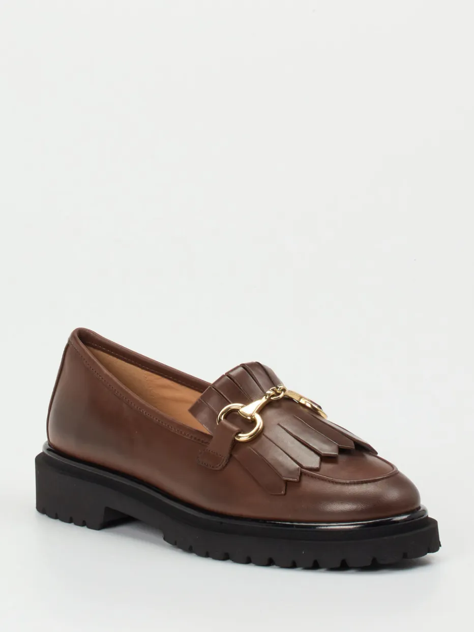 Edler Look mit modernem Profil.Andrea Puccini präsentiert mit diesem Damen-Loafer eine stilbewusste Ergänzung für Büro und Alltag. Die Kombination aus kaffeebraunem Kalbleder in glänzender Optik und klassisch flacher Silhouette trifft auf markante Details wie Fransenapplikation und goldfarbene Spange. Die geschmackvoll integrierte schwarze Leichtzellsohle mit Profil verleiht dem Modell einen modernen Twist und guten Halt. Dank Schlupfschuh-Design und cognacfarbenem Innenfutter aus Ziegenleder ist der Tragekomfort ebenso überzeugend. Passend zum aktuellen Chunky-Loafer-Trend lässt sich dieses Modell vielseitig kombinieren – ob zu Anzughose oder Midirock. Andrea Puccini vereint zeitlose Eleganz mit trendbewusster Raffinesse.