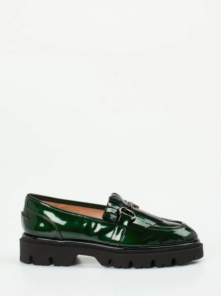 Dieser Loafer kombiniert glänzendes Lackleder in Modefarbe mit Chunky-Sohle und edler Trensengarnitur – ideal für trendbewusste City-Looks.