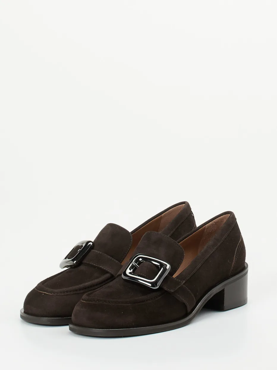 Für stilvolle Auftritte im Büro oder beim Spaziergang durch die Stadt bietet dieser dunkelbraune Velourslederschuh mit mattierter Oberfläche und dekorativer Schnalle aus Metall eine gelungene Mischung aus Komfort und Understatement. Der stabile Blockabsatz in Holz-Optik sowie die leicht eckige Kappe sorgen für eine ausgewogene Silhouette. Innen sorgt weiches Kalblederfutter in Cognac für angenehmes Tragegefühl. Stilistisch verbindet das Modell Retro-Anklänge mit einem modernen Quiet-Luxury-Charme. Besonders harmonisch in Kombination mit Kaschmirmantel und Lederhandtasche.