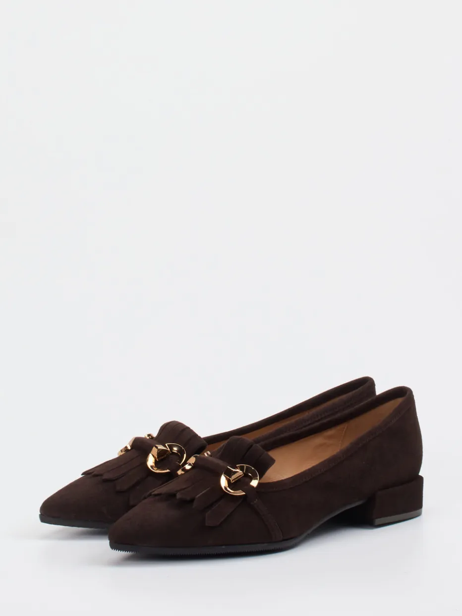 Stilvoller Klassiker für Büro und Freizeit.Der Damen-Loafer von Andrea Puccini verbindet hochwertige Verarbeitung mit ausgesuchtem Design. Ob zum Business-Outfit oder zum City-Look – dieser Loafer überzeugt durch seine flache, klassische Form und das edle Veloursleder in Dunkelbraun, das samtig angeschliffen eine dezente Tiefe erzeugt. Die Fransen-Applikation mit goldfarbener Schnalle verleiht dem Modell eine elegante Note, während die flexible Gummisohle Komfort bei jedem Schritt garantiert. Als Teil des „Quiet Luxury“-Trends bietet dieser Slipper geschmackvolle Zurückhaltung und stilsichere Modernität. Harmoniert ideal mit Kaschmir und Lederaccessoires in Naturtönen. Ein Schuh mit klassischer Formkultur und luxuriösem Purismus.