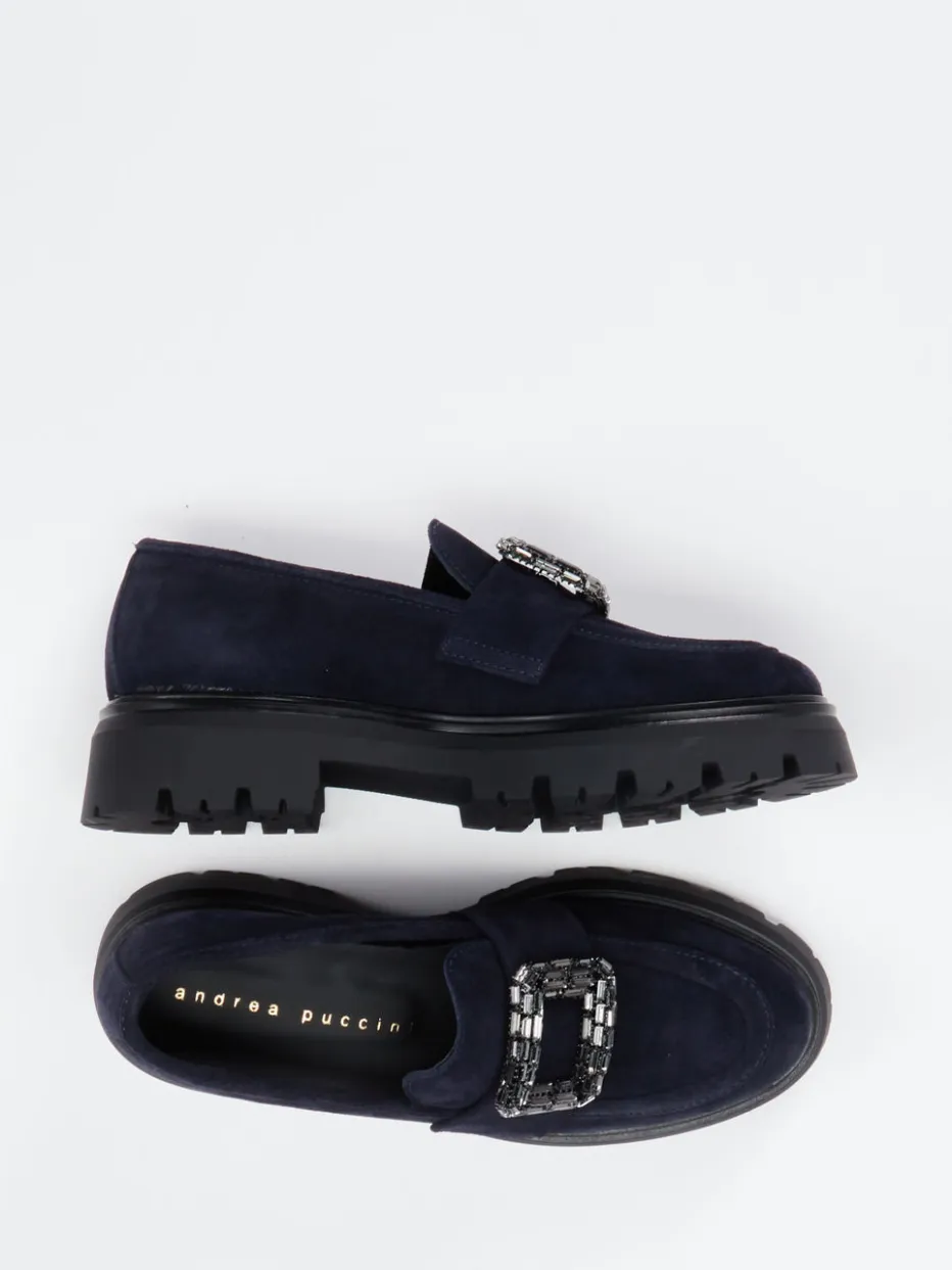 Stilvolles Statement für moderne Metropolen.Der Damen-Loafer von Andrea Puccini überzeugt mit hochwertigem Veloursleder in sattem Dunkelblau. Ideal für den täglichen Einsatz in City und Freizeit, kombiniert er ein samtig mattes Obermaterial mit hochwertiger Verarbeitung und einer auffällig profilierten Gummisohle. Die funktionale Schlupfform wird durch eine glamouröse Zierspange mit facettiertem Strassbesatz aufgewertet. Seine klassische Silhouette erhält durch das Chunky-Design ein modisches Update – perfekt für Trendsetterinnen mit urbanem Anspruch. Besonders harmonisch wirkt dieser Schuh zu cropped Jeans oder monochromen Hosenanzügen. Verbindet italienisches Design mit sicherem Stilgefühl und femininer Stärke.