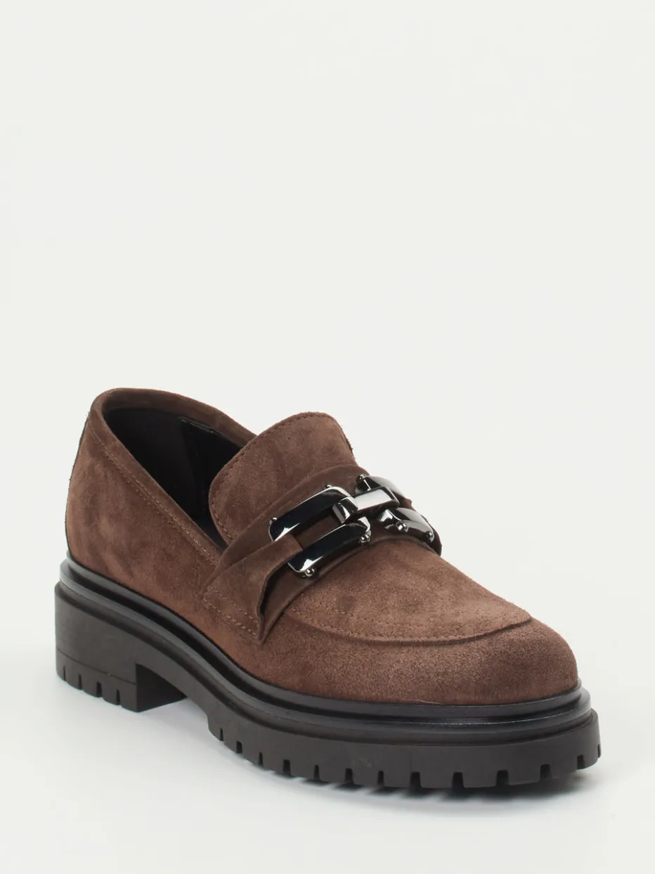 Chunky trifft auf Understatement.Andrea Puccini interpretiert den klassischen Damenloafer neu. Ideal für urbane Outfits im Business-Casual-Stil: Dieser Loafer besteht aus weich verarbeitetem Veloursleder in Mittelbraun. Die klare, lowcut Silhouette wird durch eine anthrazitfarbene Gliederketten-Garnitur auf dem Blatt veredelt. Eine profilierte Gummisohle mit auffälligem Rahmen verleiht trendige Präsenz und Bodenhaftung. Die Schlupfform unterstreicht den minimalistischen Charakter, während die Kombination aus gedeckter Farbe und auffälliger Sohle den „Quiet Luxury“-Stil aufgreift. Stilistisch harmoniert er perfekt mit Strickkleidern oder Wollhosen. Stilsicherer Komfort mit italienischem Designanspruch.