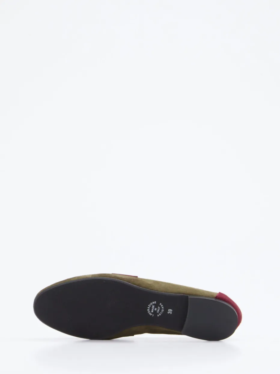 Modernes Farbspiel im klassischen Stil.Andrea Puccini präsentiert mit diesem Loafer ein elegantes Modell für Damen. Ideal für gepflegte Alltagslooks und Business-Outfits, verbindet der flache Slipper weiches Veloursleder mit matter Oberfläche in Olivgrün und Akzenten in Dunkelrot. Die klassische Form unterstreicht den Preppy-Charakter, während Zierspange und Kontrastbesatz aus dem Color-Blocking-Trend schöpfen. Eine flexible Gummisohle und das gepolsterte Lederfußbett sorgen für Komfort. In Kombination mit Bügelfaltenhose oder Jeans ein souveräner Auftritt. Stilvoller Komfort in trendbewusster Farbgebung – typisch Andrea Puccini.
