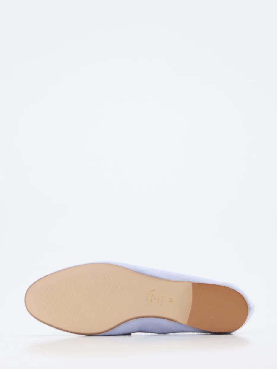 Ideal für den Büroalltag oder den Stadtbummel: Das ungefütterte Veloursleder wirkt durch seine matte Oberfläche und die sanfte Pastellflieder-Färbung besonders edel. Die klassische, flache Silhouette mit offenkantiger Zierlasche und Ton-in-Ton-Nähten sorgt für einen dezenten Preppy Chic. Die farblich abgesetzte Gummisohle bietet angenehmen Laufkomfort, während leichte Prägungen am Fersenbereich für einen feinen Markenakzent stehen. Harmoniert besonders gut mit hellen Stoffhosen oder fließenden Röcken.
