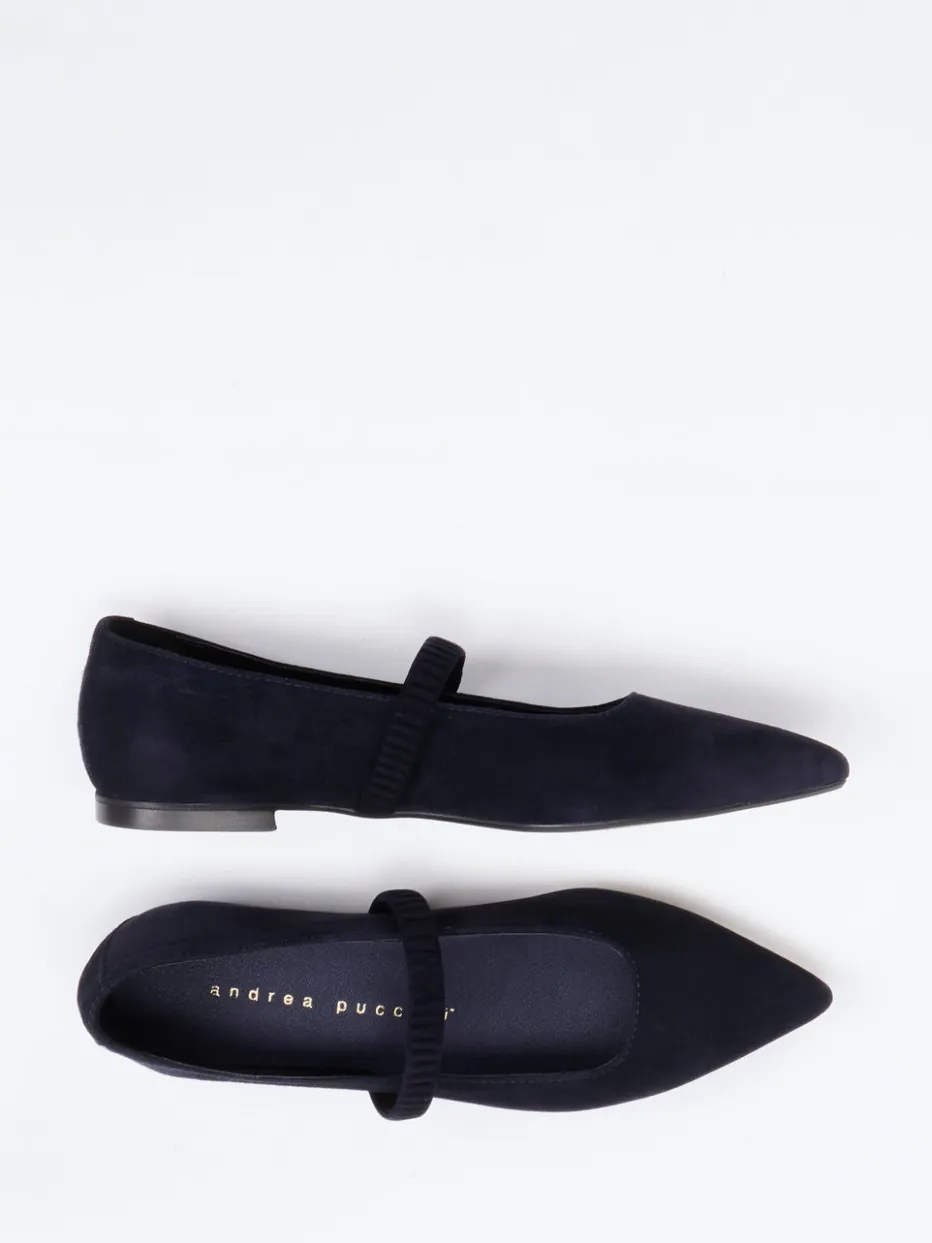 Stilvolle Zurückhaltung mit femininer Note.Andrea Puccini präsentiert klassische Mary Jane Ballerinas für Damen. Ideal für Büro oder Freizeit, überzeugen sie mit nachtblauem Veloursleder, das samtig-matt wirkt und sich weich anschmiegt. Die spitz zulaufende Silhouette sorgt für eine moderne, elegante Linie. Ein elastischer Riemen passt sich automatisch an und betont zugleich den retrofemininen Look. Die flache Konstruktion mit feiner Gummisohle bringt komfortable Leichtigkeit – passend zum Trendthema „Balletcore“. Besonders harmonisch wirkt die Kombination zu einer Stoffhose oder fließenden Culotte in gedeckten Tönen. Designbewusste Eleganz trifft auf handwerkliche Qualität von Andrea Puccini.