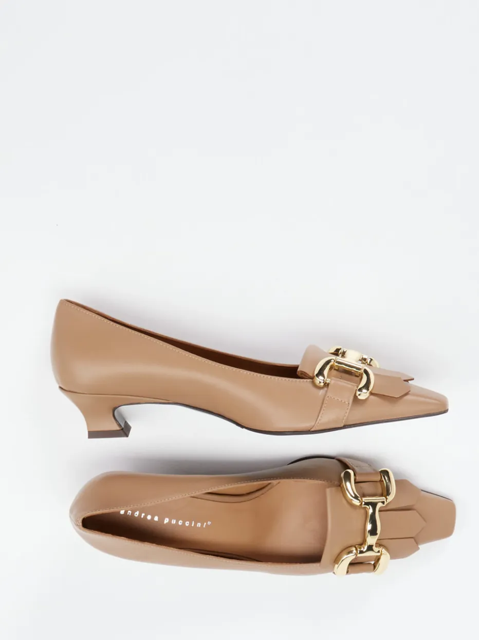 Eleganz im Zeichen des Understatements.Andrea Puccini interpretiert mit diesen Pumps die Loafer-Ikone neu. Ideal für Business-Termine oder elegante Abendmomente: Feines Lammleder in samtigem Beigebraun trifft auf eine spitz zulaufende Silhouette mit femininem Kitten Heel. Die matt gehaltene Oberfläche und eine goldfarbene Trensenschnalle setzen dezente Highlights im Sinne des Quiet-Luxury-Trends. Dank gepolsterter Innensohle und Halbsohle in Leder und Gummi werden Stil und Komfort gleichermaßen bedient. Kombinierbar mit Creme-Tönen oder monochromen Looks. Hochwertige Materialien und klare Formensprache stehen für die italienisch inspirierte Handschrift der Marke.