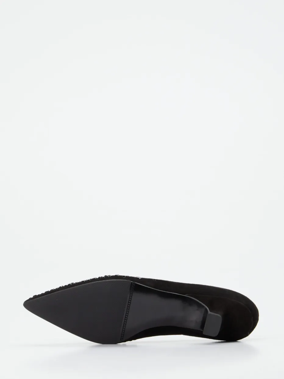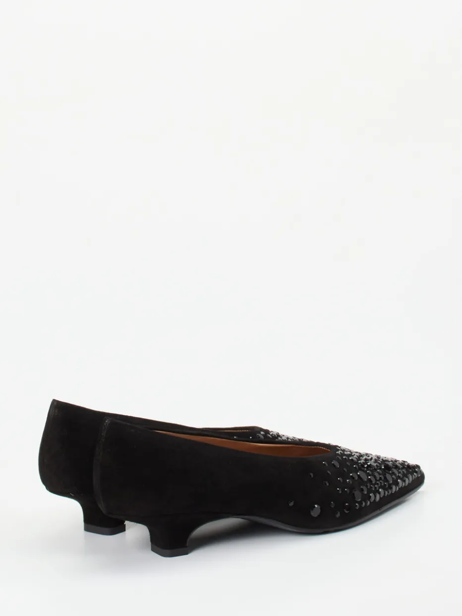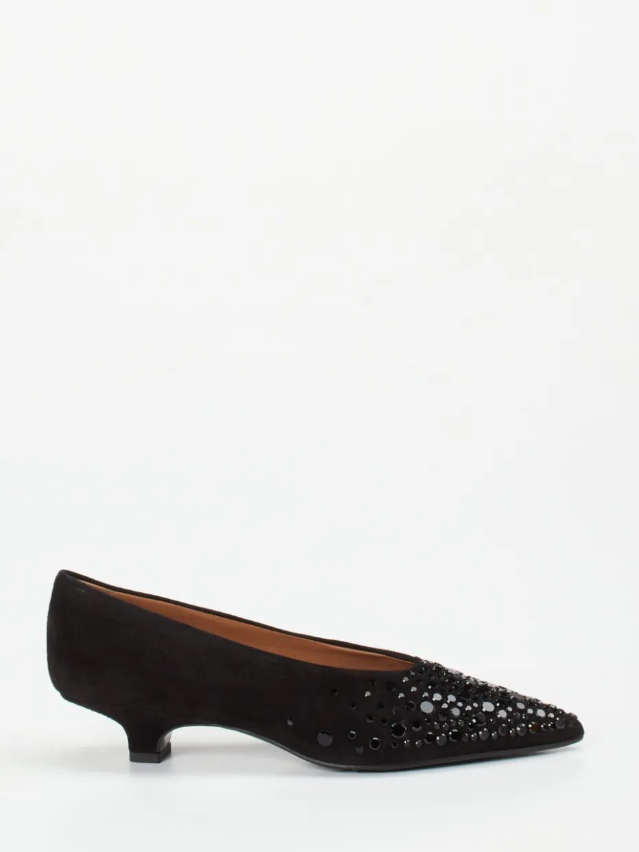 Feines Veloursleder trifft auf schimmernde Strassdetails und einen femininen Kitten Heel: ein stilvolles Modell für elegante Auftritte mit Haltung.
