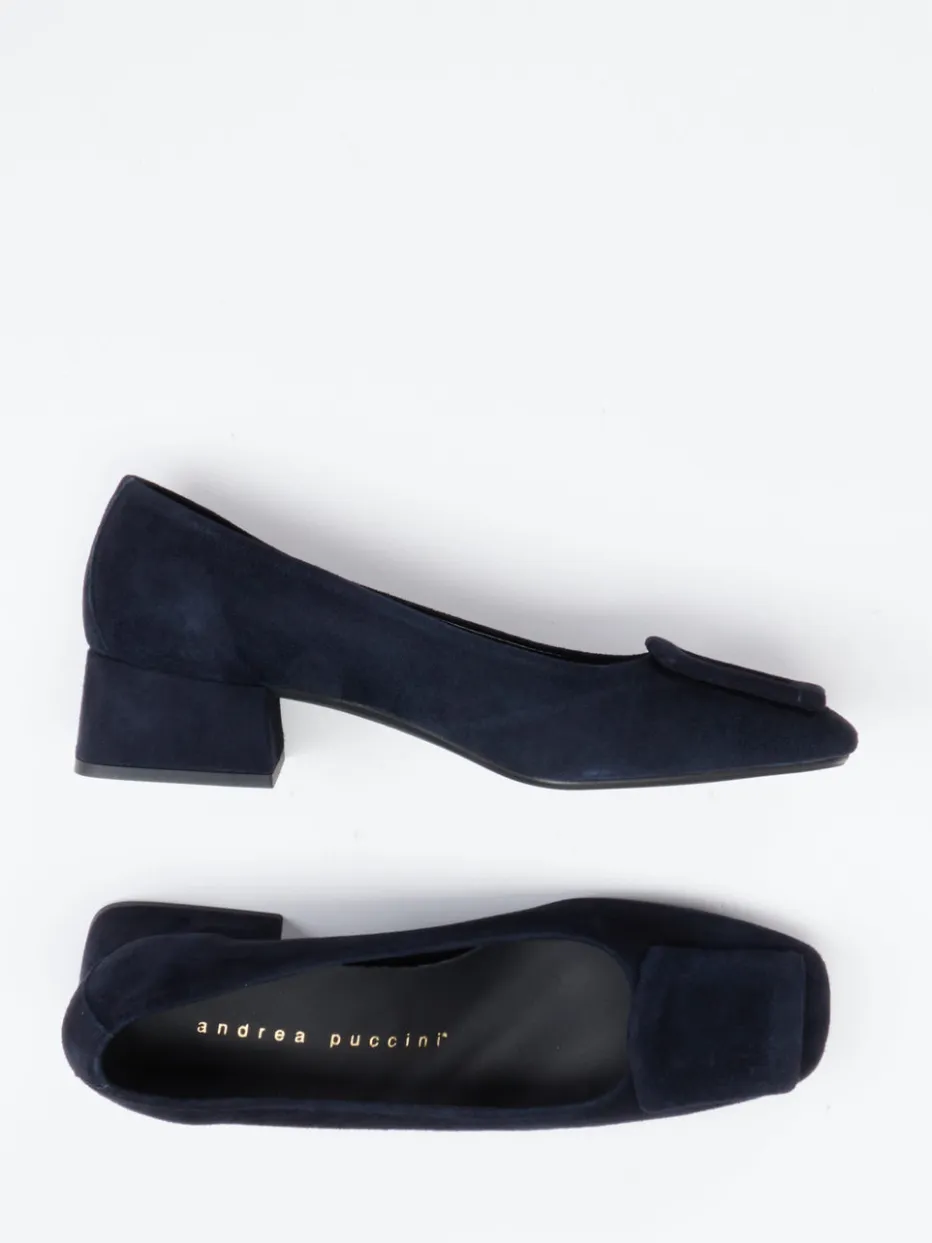 Eleganter Minimalismus neu interpretiert.Andrea Puccini präsentiert stilvolle Damen-Pumps mit klassischer Silhouette. Ideal für einen souveränen Auftritt im Büro oder bei entspannten Stadtbummeln: Das Modell aus samtigem Veloursleder überzeugt in tiefem Dunkelblau mit matter Oberfläche. Die leicht spitz zulaufende Form, der feminine Blockabsatz und die tonale Zierschleife auf der Schuhspitze betonen die ruhige Formsprache. Das geschmeidig ausgekleidete Innenleder sorgt für ein angenehmes Tragegefühl, die Gummisohle gibt Stabilität. Ein Modell im Stil des „Quiet Luxury“, passend für minimalistische Looks mit Struktur. Harmoniert elegant mit einem navyfarbenen Hosenanzug oder Midirock. Hochwertige Materialien und zurückhaltendes Design – dezent luxuriös im Stil von Andrea Puccini.