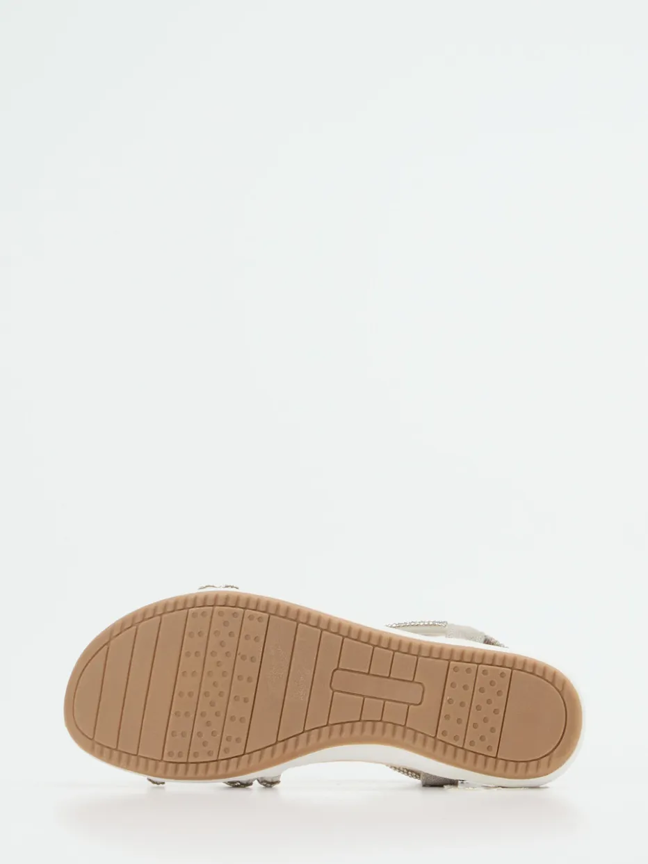 Strahlend leicht durch den Sommer.Andrea Puccini präsentiert elegante Riemchensandalen für Damen mit glänzender Ausstrahlung. Für laue Abende auf der Terrasse oder entspannte Urlaubstage bietet das silberfarbene Metallicleder mit feinem Strassbesatz einen stilvollen Auftritt. Die mehrfach überkreuzten Riemen und der elastische Fersenriemen sorgen für sicheren Halt, während das weich gepolsterte Fußbett in Kombination mit der flachen, gummierten Laufsohle angenehmen Komfort verspricht. Der champagnerfarbene Grundton unterstreicht den dezenten Glanz, der aktuell zum Trendthema „Quiet Luxury“ passt. Stilvoll zu leichten Sommerkleidern und metallicfarbenen Accessoires. Hochwertiger Sommerschuh mit funkelndem Detailanspruch im typischen Andrea-Puccini-Stil.