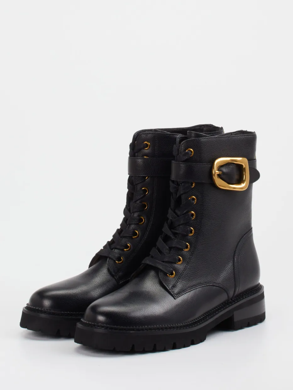 Goldene Schnallenakzente und robustes Gummiprofil vereinen sich bei diesem Modell zu einem souveränen Auftritt im Utility-Stil. Aus hochwertigem Lammleder gefertigt, bietet die Stiefelette auch komforttechnisch ein überzeugendes Gesamtbild.