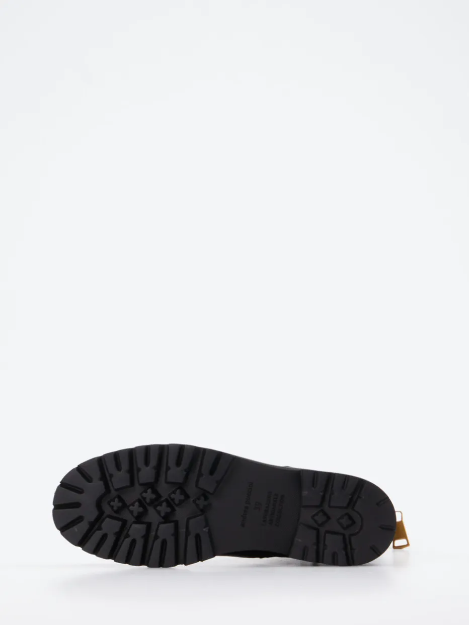 Urban-Statement in Schwarz und Gold.Andrea Puccini bietet mit dieser Stiefelette eine moderne Variante der klassischen Schnürboots. Beim Stadtbummel oder nach Feierabend in der Bar: Das Modell passt zu zwanglosen Urban-Looks. Gefertigt aus feinem Lammleder mit leicht genarbter Oberfläche, überzeugt es durch eine hochschaftige Form und markante Design-Elemente – darunter goldfarbene Ösen, eine Statement-Schnalle und ein seitlicher Reißverschluss. Die profilierte Gummisohle mit Blockoptik verleiht sicheren Halt und betont den angesagten Chunky-Stil, ideal für modisch ambitionierte Trägerinnen. Besonders passend kombiniert mit Lederjacke oder goldakzentuierter Crossbody-Bag. Designkompetenz trifft auf Qualität – typisch Andrea Puccini.