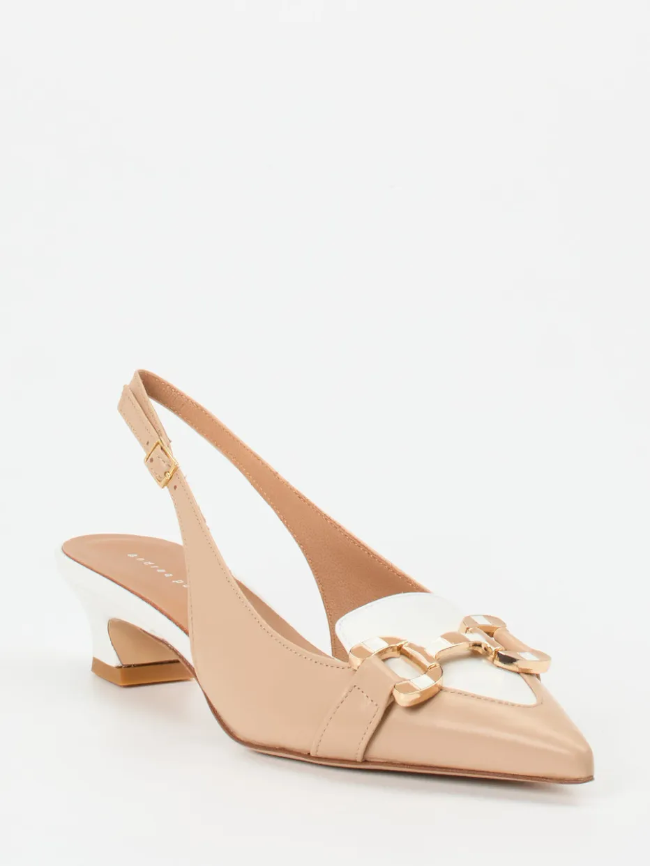 Eleganz und Zurückhaltung prägen das Design dieser Slingback-Pumps aus weichem Lammleder. Feine Details wie die goldene Schnalle und der zweifarbige Absatz setzen stilvolle Akzente.