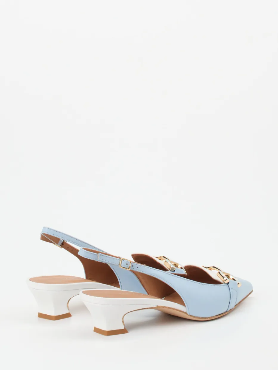 Pastell trifft Eleganz.Andrea Puccini interpretiert mit diesen Slingpumps feminine Zurückhaltung auf höchstem Niveau. Die Kombination aus pastellblauem und weißem Lammleder verleiht dem Schuh eine frische, detailverliebte Optik. Die spitz zulaufende Form, ein schmaler 3,5-cm-Absatz und die glänzende Oberfläche unterstreichen den filigran-eleganten Look. Besonderer Hingucker: die goldfarbene Spange auf dem Spann, die einen Hauch von Retro-Chic versprüht. Der verstellbare Fesselriemen sorgt für sicheren Halt. Ideal für festliche Anlässe oder stilbewusste Business-Outfits in der Übergangszeit. Ein Modell mit raffinierter Leichtigkeit – typisch Andrea Puccini.