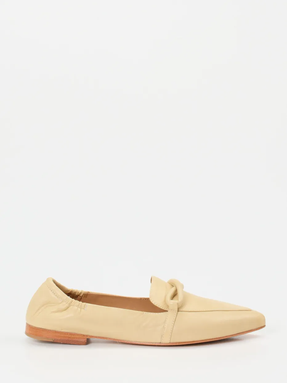 Eleganz für jeden Sommertag.Der Damen-Slipper von Andrea Puccini zeigt sich als moderne Loafer-Variante mit femininer Linienführung. Ideal für Büro oder City-Tage bietet das beigefarbene Modell aus vanillefarbenem Lammleder eine matte Oberfläche und eine spitz zulaufende Silhouette. Das dekorative Knotendetail auf dem Spann betont den cleanen Look. Ein elastischer Fersenbereich sorgt für ein komfortables Hineinschlüpfen, während das feine Innenfutter und die Ledersohle mit Gummieinsatz langlebige Qualität garantieren. Modisch eingebettet im Trend „Quiet Luxury“. Ein zurückhaltendes Statement für puristische Looks – mit italienischer Nonchalance veredelt.