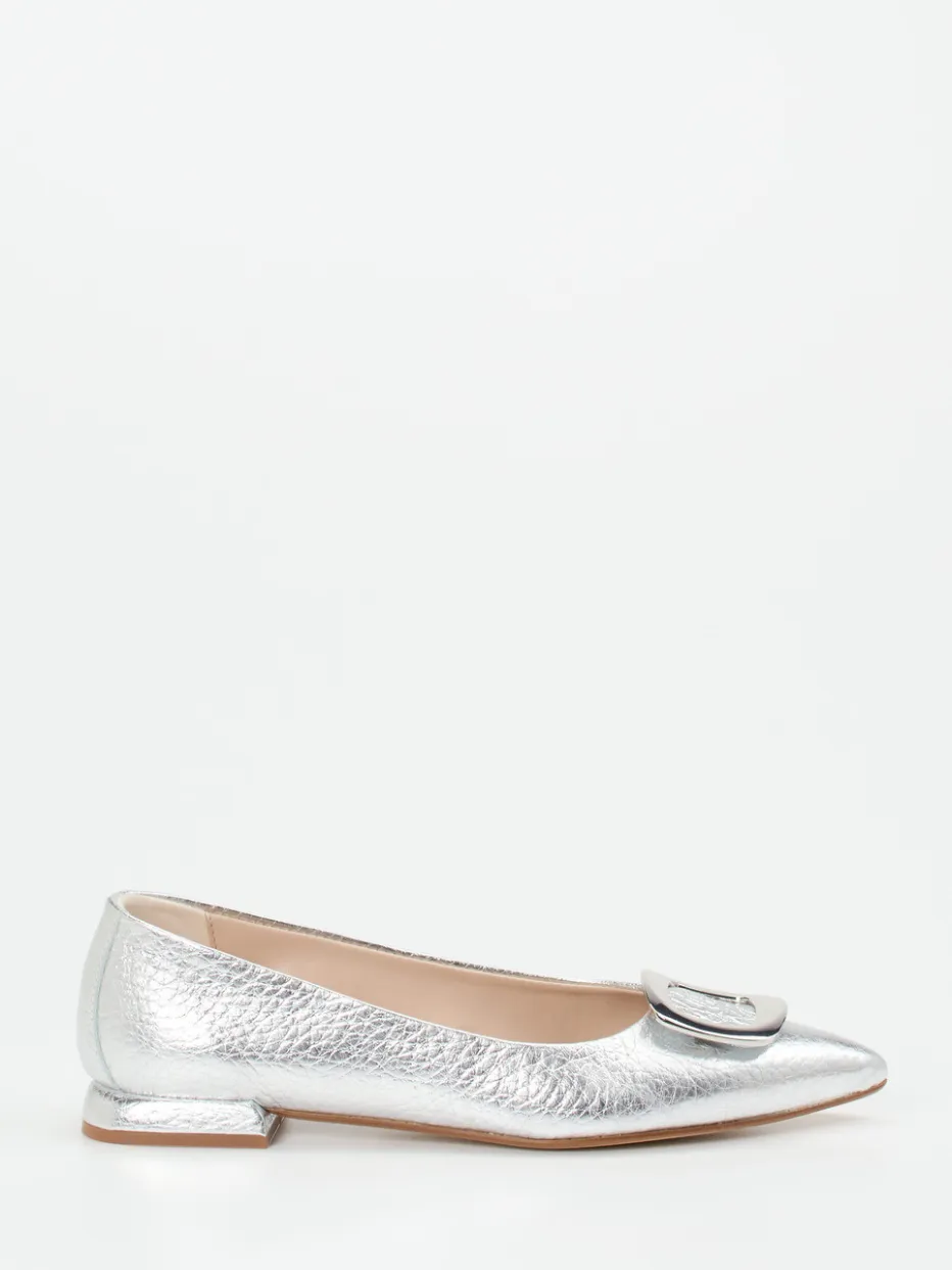 Diese Ballerinas verkörpern modernen Glamour mit minimalistischem Anspruch. Silberfarbenes Metallicleder und die markante Schnalle setzen ein stilvolles Statement.