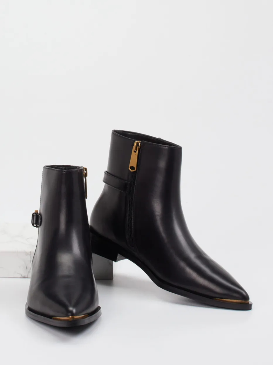Ideal für anspruchsvolle Alltagssituationen, überzeugt das Modell durch hochwertiges, glänzendes Glattleder mit goldfarbenem Metallbesatz an der Spitze. Die spitz zulaufende Front und eine goldene Zierschnalle unterstreichen das elegante Design. Ein seitlicher Reißverschluss sorgt für Komfort, während die Gummisohle Alltagstauglichkeit verspricht. Die zurückhaltend-klassische Silhouette trifft moderne Trends wie „Quiet Luxury“.