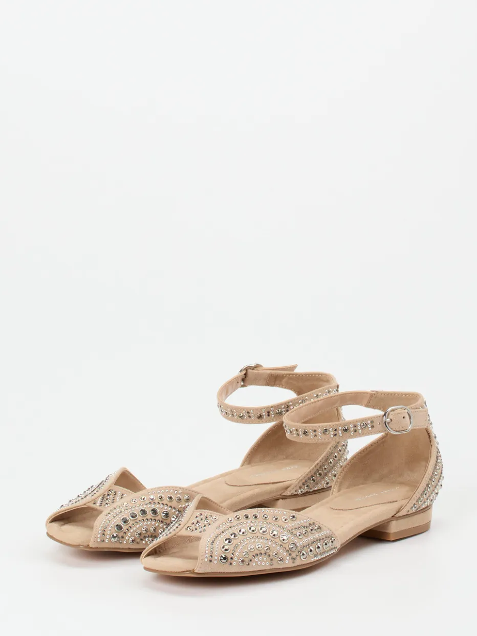 Strass trifft Sommerglanz.Andrea Puccini zeigt eine Zehensandale, die modische Raffinesse mit sommerlicher Leichtigkeit verbindet. Bei Partys im Freien oder festlichen Empfängen sorgt das matt-beige Textilmaterial in Veloursoptik mit edler Strassverzierung für einen stilvollen Auftritt. Die offene Silhouette mit Fersen- und Knöchelriemen formt eine feminine Linie, während die silberfarbenen Schmucksteine in geschwungener Wellenform dem Design ornamentale Eleganz verleihen. Der verstellbare Riemen mit Metallschnalle garantiert optimalen Sitz. Akzente aus der Vintage- und Metallic-Trendwelt runden den Look ab. Passt hervorragend zu fließenden Abendkleidern oder cropped Stoffhosen in Pastell. Gekonnt kombinierter Minimalismus für stilbewusste Sommermomente.