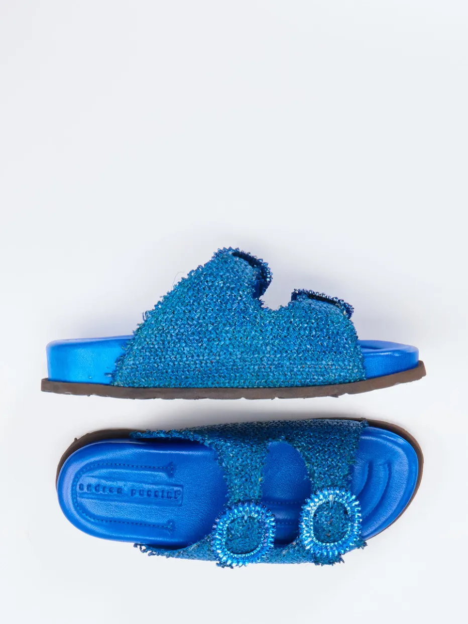 Eyecatcher mit urbanem Glamour.Andrea Puccini präsentiert eine modische Damen-Zweiriemer-Pantolette für stilvolle Sommermomente. Ideal für Freizeit oder Partynächte: Das kobaltblaue Textil mit glitzernder Oberfläche und changierenden Details macht die offene Silhouette zum Highlight. Zwei verstellbare Riemen mit kristallbesetzten Schnallen setzen funkelnde Akzente. Das weich gepolsterte Fußbett und das Farblich abgestimmte Kalblederfutter sorgen für ein angenehm luftiges Tragegefühl. Die schokoladenbraune Gummisohle bietet sicheren Halt. Inspiriert von Y2K-Ästhetik und dem „Glitter Texture“-Trend der Saison. Ein expressiver Sommerschuh mit innovativer Materialwirkung und bequemem Styling-Vorteil.