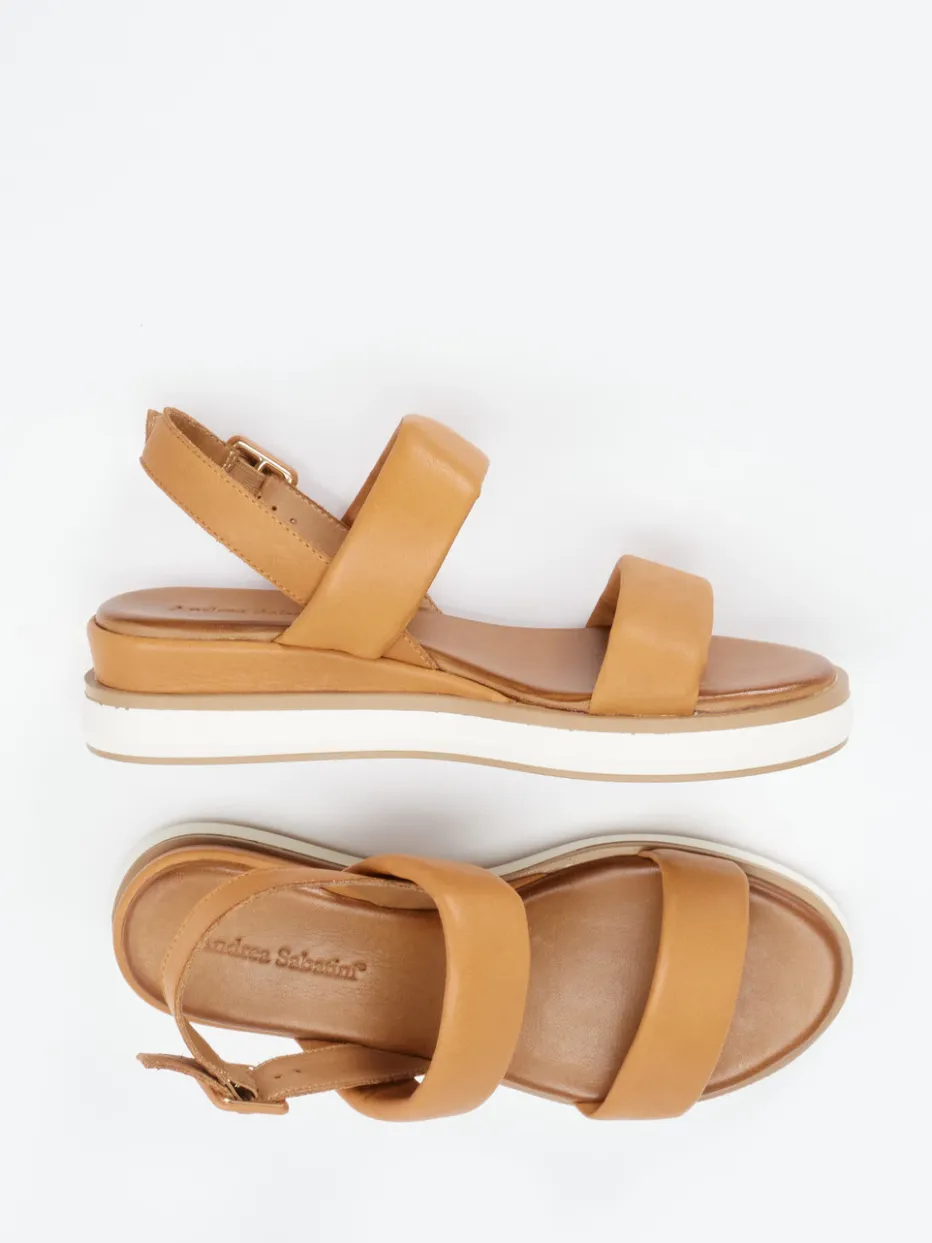 Natürlich feminine Begleiterin.Andrea Sabatini präsentiert klassische Plateau-Sandalen für Damen. Diese Keilsandalette erfüllt sommerliche Ansprüche an Komfort und Design. Aus hochwertigem Kalbleder in Cognac gefertigt, zeigen sich die matt strukturierten Riemen weich gepolstert und mit einer edlen, mattgoldenen Dornschließe verstellbar. Die offene, flache Form mit 4,5 cm hohem Keilabsatz und 2 cm Plateau gibt Halt und Leichtigkeit zugleich. In Weiß-Hellbraun gehalten, ergänzt die Gummisohle das Gesamtbild in natürlichen Ton-in-Ton-Nuancen. Ideal für Freizeit-Looks mit Leinen und Canvas. Stilbewusste Lässigkeit mit italienischem Feinsinn.