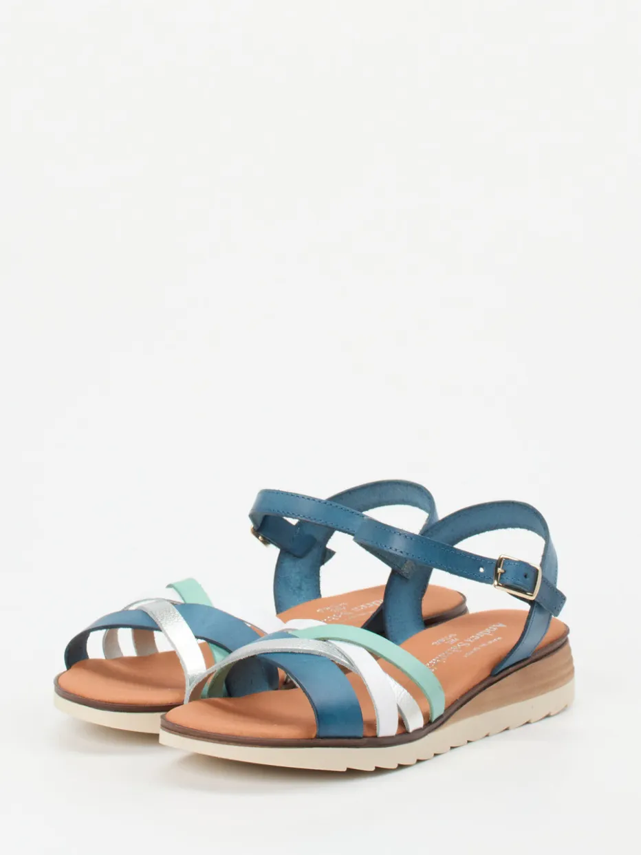 Farbenfroher Komfort für warme Tage.Die spanische Marke Andrea Sabatini bietet mit dieser Riemchensandale ein stilvolles Sommermodell für Damen. Im Alltag oder auf Reisen überzeugt das multicolore Design mit gekreuzten Riemen aus matt wirkendem Glattleder in Petrolblau, Mintgrün, Weiß und Silber. Die goldfarbene Metallschnalle am verstellbaren Knöchelriemen sorgt für individuelle Passform, während das weich gepolsterte Fußbett Komfort bei jedem Schritt bietet. Optisch bringt die leichte Keiloptik der beigebraunen Gummisohle moderne Lässigkeit ins Spiel – ganz im Trend von Color-Blocking und Casualwear. Eine vielseitige Begleiterin mit stilprägender Farbkomposition und angenehmem Laufgefühl.