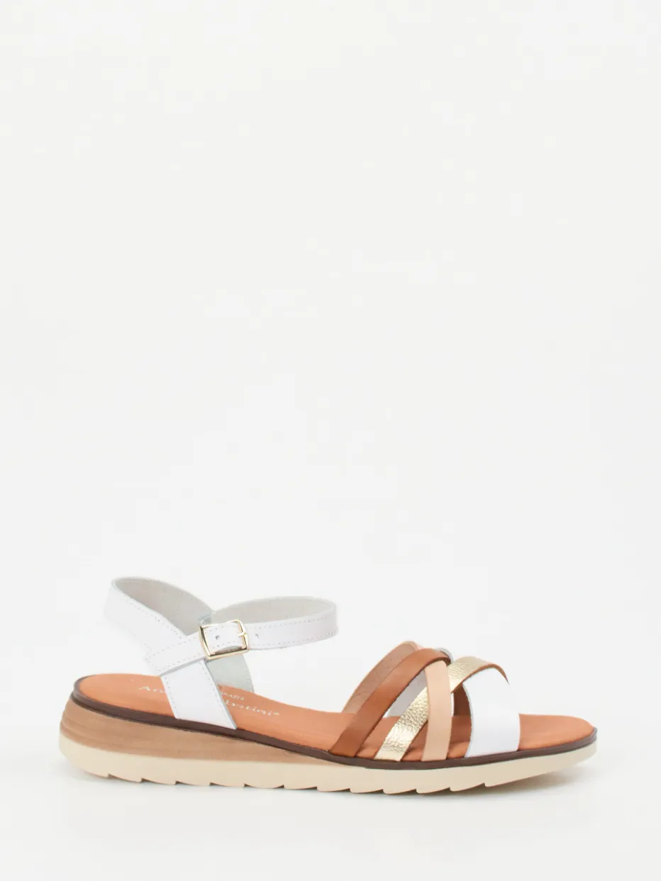 Farbenfroher Komfort für warme Tage.Die italienisch inspirierte Ledersandale von Andrea Sabatini interpretiert sommerliche Lässigkeit modern und stilvoll. Cross-over in Alltag und Urlaub: Die flache Sandale aus hochwertigem Glattleder zeigt sich in Weiß, Cognacbraun und Metallic-Gold. Gekreuzte Riemchen, darunter ein glänzend-metallischer Akzent, setzen modische Highlights. Der goldfarbene Verschluss am verstellbaren Knöchelriemen sorgt für individuelle Passform. Die rutschhemmende Gummisohle sowie das weich gepolsterte Fußbett versprechen einen hohen Tragekomfort. Lässt sich ideal zu Leinenkleidern oder anderen natürlichen Materialien kombinieren. Stilvolle Leichtigkeit mit spanischem Flair – bequem und modisch zugleich.