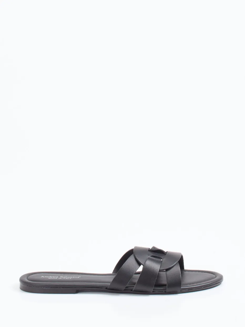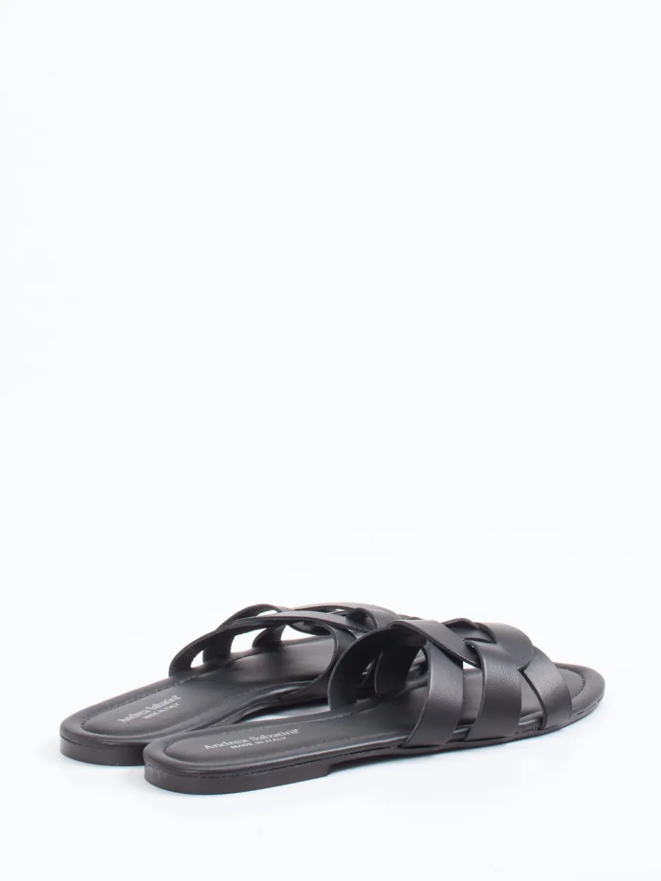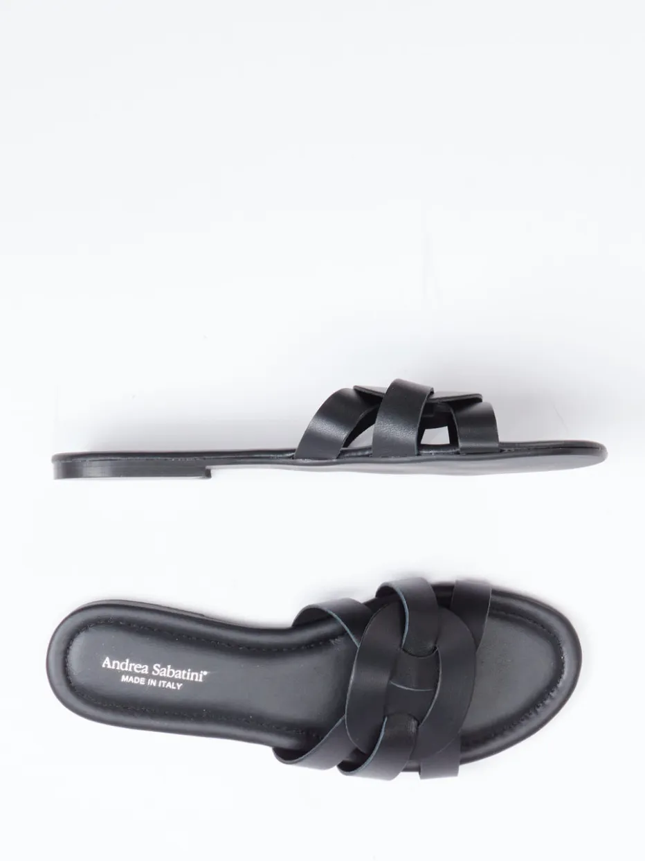 Sommer trifft Stil.Die Slides von Andrea Sabatini für Damen sind aus feinstem schwarzem Kalbleder gefertigt. Ob auf Reisen oder in der Stadt – diese Pantolette erfüllt den Wunsch nach reduziertem Design und hohem Tragekomfort. Das matt strukturierte Leder setzt in Kombination mit gekreuzten Riemen und Ton-in-Ton-Optik dezente Akzente. Die flache Silhouette, das weiche Lederfußbett und die flexible Kunststoffsohle bieten ein angenehmes Laufgefühl für Freizeit und Urlaub. Inspiriert vom mediterranen Chic, passt das Modell ideal zu monochromen Looks oder Leinenstoffen. Andrea Sabatini steht für handwerkliches Können und zeitlose Designraffinesse.