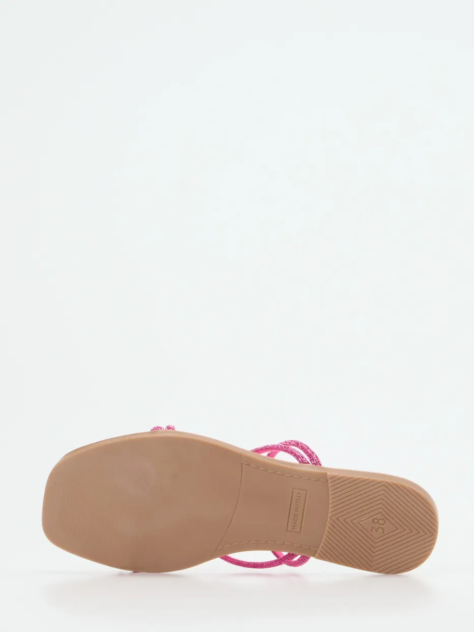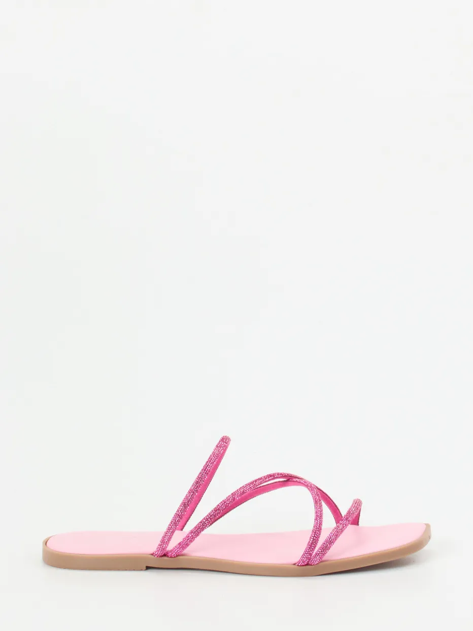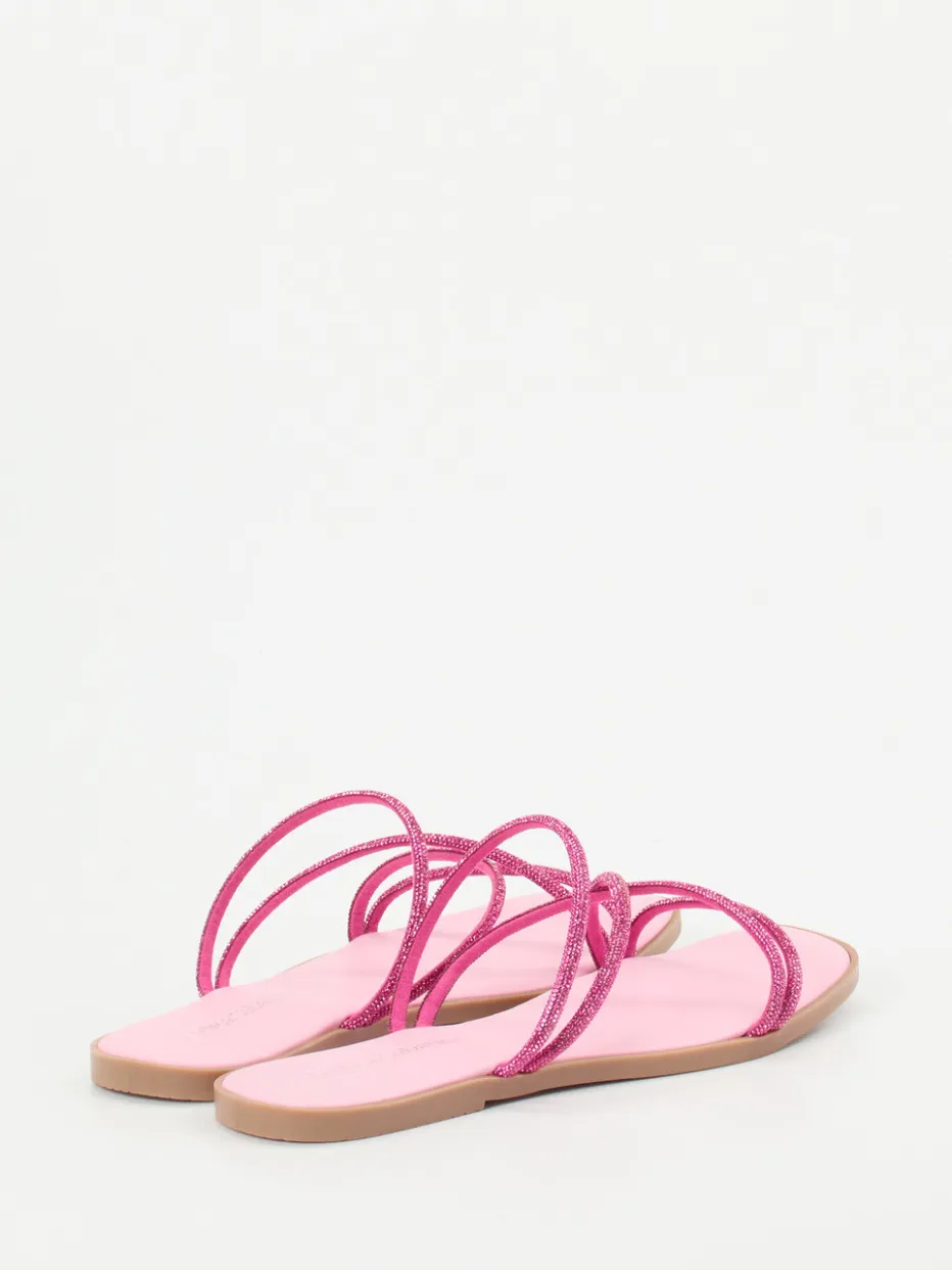 Filigrane Glitzerriemen in angesagtem Rosa setzen ein stilvolles Statement für trendorientierte Sommer-Looks. Die Pantolette überzeugt durch eine leichte Kunststoffsohle und glänzende Y2K-Ästhetik.