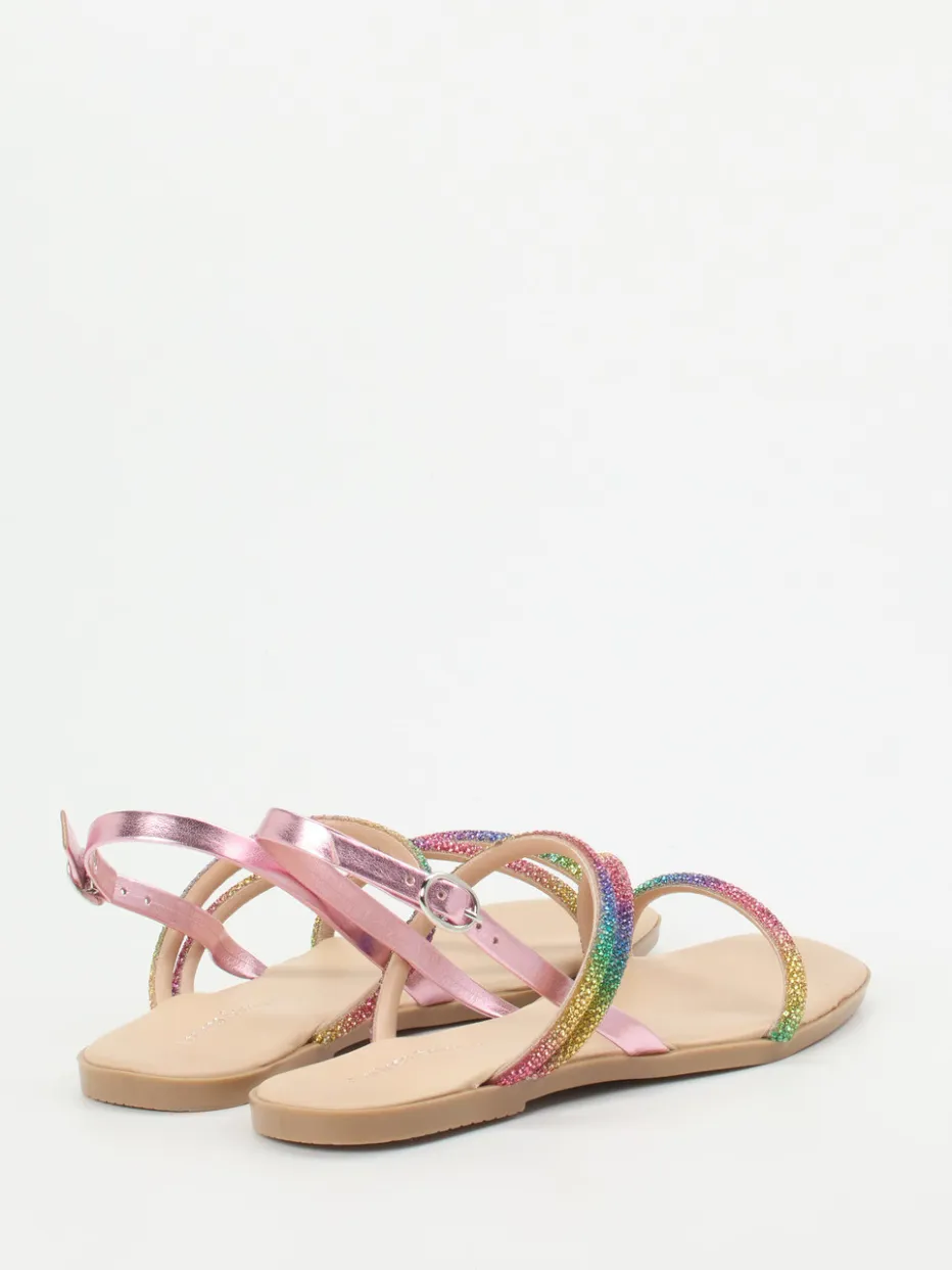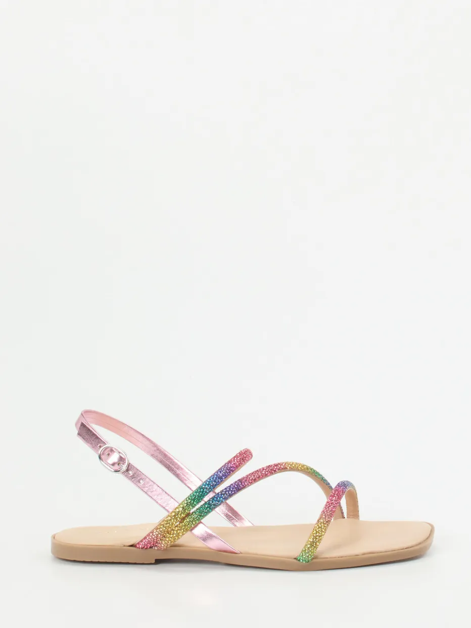 Der aufwendig mit Rainbow-Strass verzierte Zehentrenner verbindet sommerliche Leichtigkeit mit glamourösen Y2K-Akzenten. Metallicleder sorgt für einen ausdrucksstarken Look.