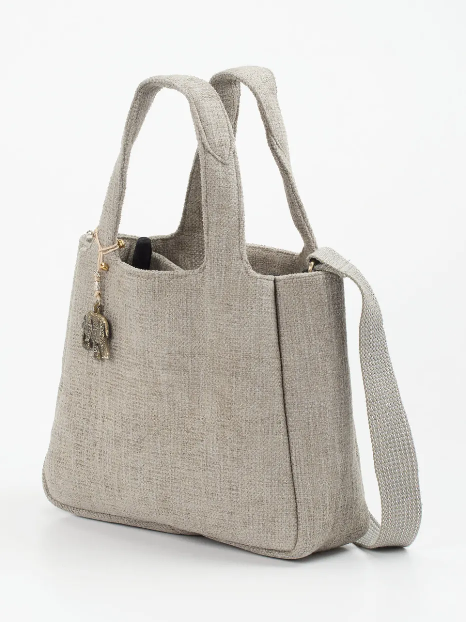Struktur mit Stil.ANOKHI zeigt mit dieser Damen-Shopper Bag eine modische Begleitung für Alltag und Büro. Ideal für strukturierte Tagespläne: Der geräumige Shopper aus Textil präsentiert sich mit grober Webstruktur in Steingrau – eine natürlich anmutende Textur mit dezentem Bouclé-Charakter. Die trapezförmige Silhouette, goldfarbene Karabinerverschlüsse sowie ein filigraner Zieranhänger in Elefantenform setzen stilvolle Akzente. Praktische Doppelhenkel und ein verstellbarer Riemen bieten flexible Tragemöglichkeiten. Im Trend mit Quiet Luxury, betont der Look dezente Eleganz. Kombiniert sich hervorragend mit hellen Naturstoffen. Der Anspruch: reduzierter Chic mit sanfter Textilästhetik – ganz ANOKHI.