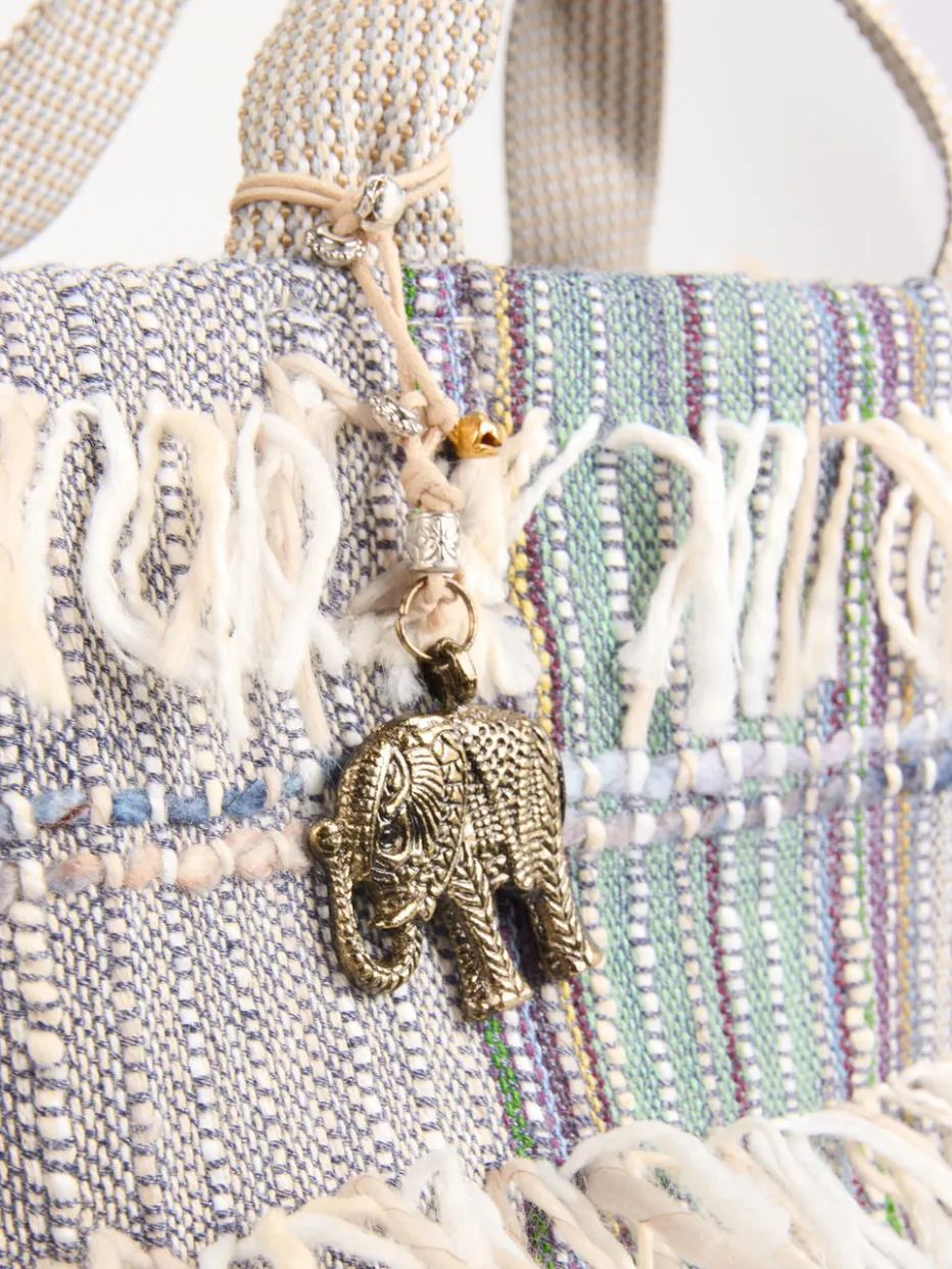 Der ANOKHI-Shopper kombiniert grob gewebtes Textil mit farblich abgestimmtem Streifendesign und Boho-inspirierten Details – ideal für entspannte Sommer-Looks mit großzügigem Stauraum.