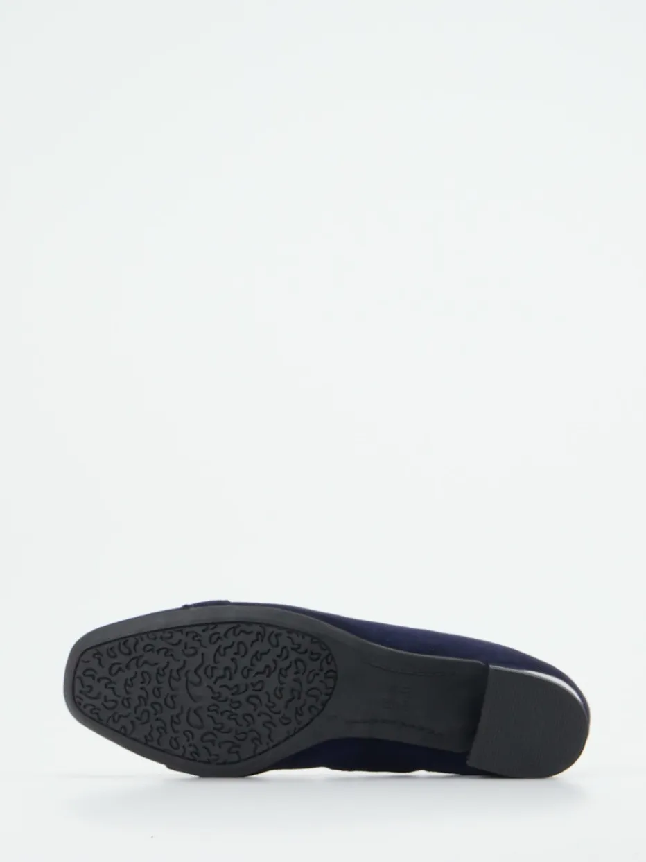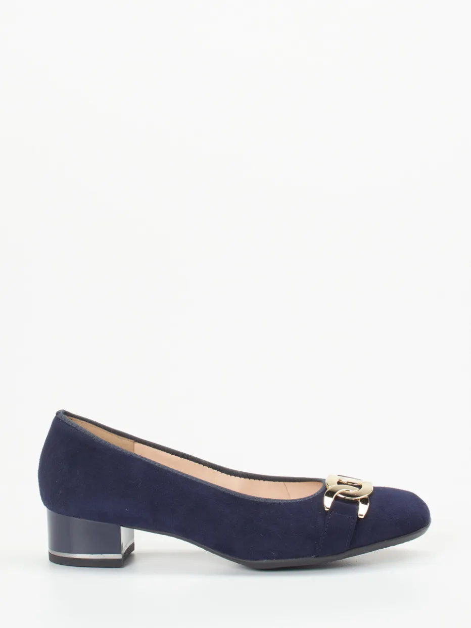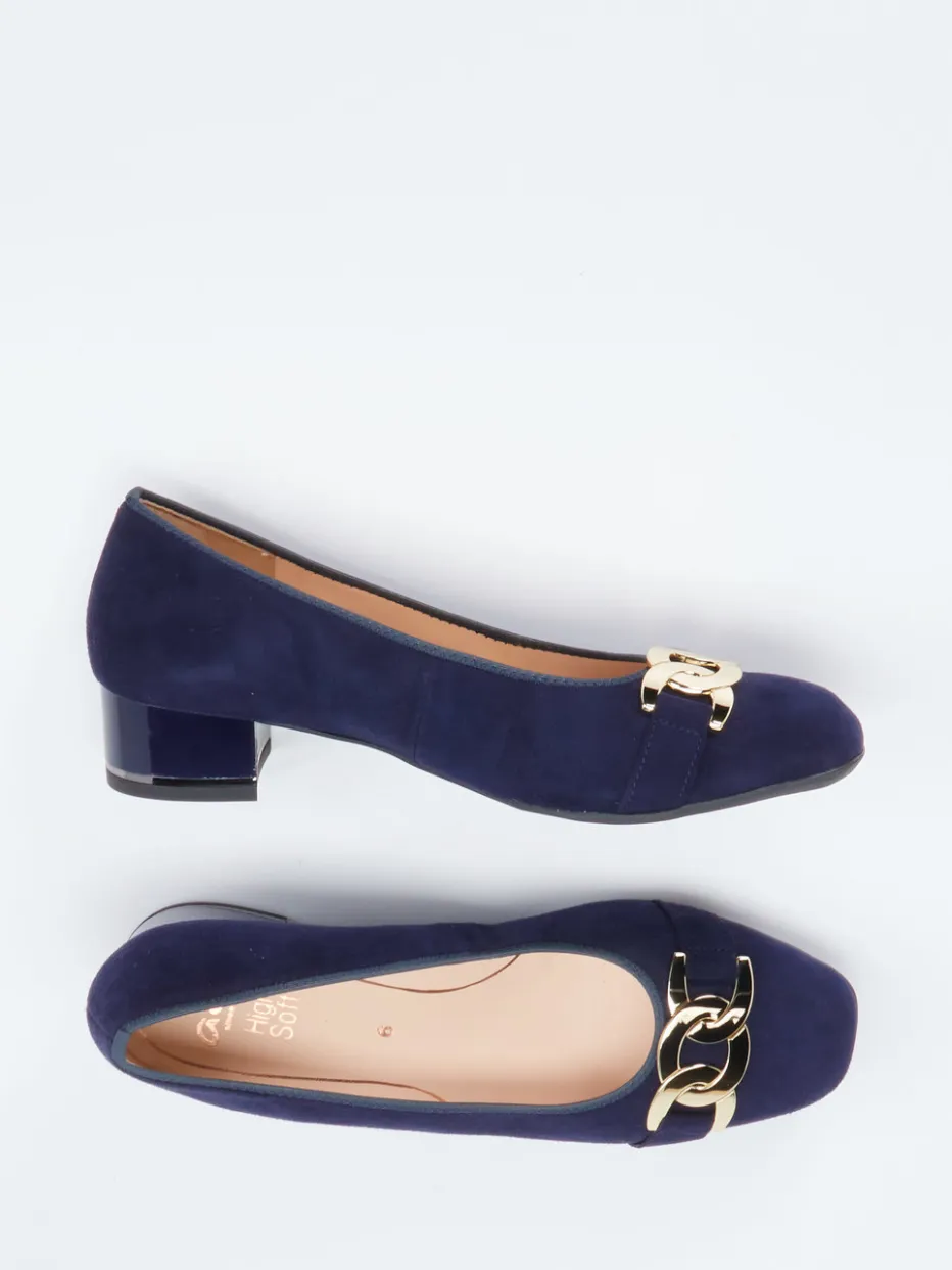 Ob zum Businessoutfit oder für stilvolle Alltagslooks – das dunkelblaue Veloursleder strahlt eine samtige Raffinesse aus. Die rund zulaufende Silhouette ist zeitlos, während die goldfarbene Gliederkette auf dem carréförmigen Blattelement ein edler Blickfang ist. Der 3 cm hohe Lackabsatz mit silbernem Kontraststreifen greift moderne Retro-Ästhetik auf. Dank Weite H und HighSoft-Ausstattung überzeugt dieses Modell auch durch exzellenten Tragekomfort. Ideal kombinierbar mit schlichter Handtasche und goldfarbenem Schmuck.