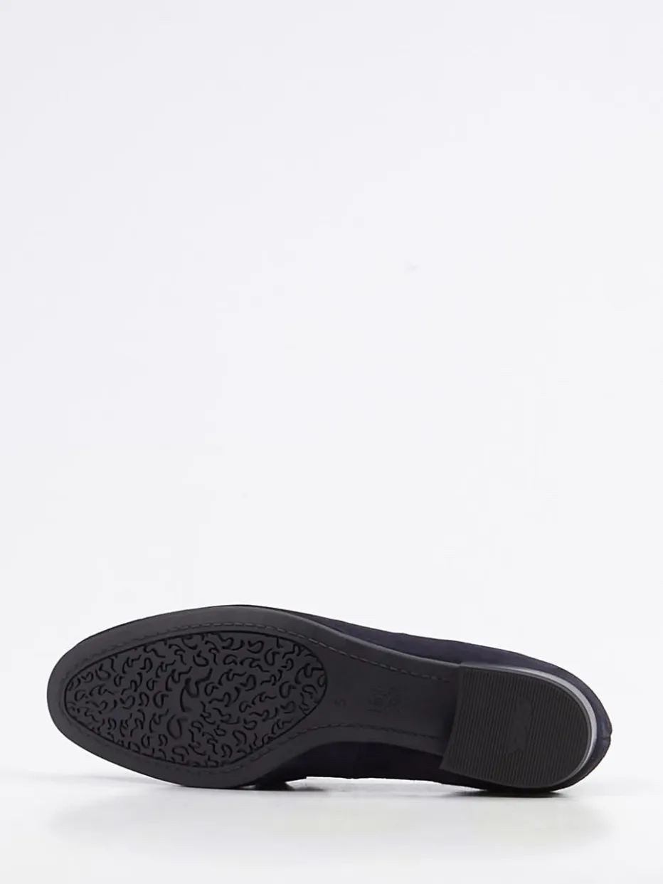 Das dunkelblaue Veloursleder zeigt sich samtig-matt und wird durch eine silberfarbene Spange akzentuiert. Die klassische Silhouette mit flachem Absatz und flexibler Gummisohle unterstreicht den minimalistischen Look und sorgt dank High Soft Fußbett für angenehmen Komfort. In der Schlupfform überzeugt der Schuh in Preppy-inspirierter Quiet-Luxury-Ästhetik. Kombiniert mit grauen Stoffhosen oder hellen Röcken entfaltet er seine zeitlose Wirkung besonders gut.