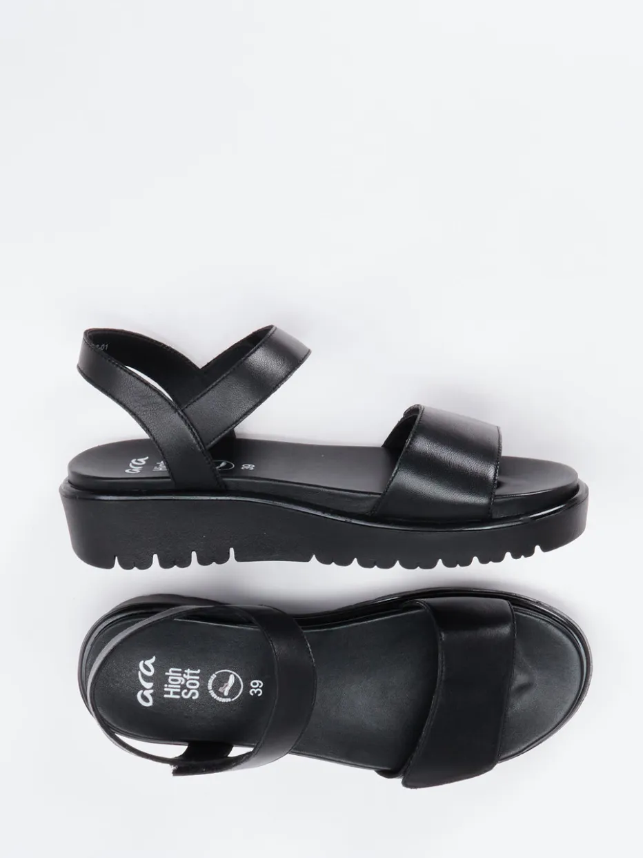 Stilsicher durch den Sommer.Die Marke Ara präsentiert mit dieser Sandale ein komfortorientiertes Modell für Damen. Ideal für den Alltag oder die nächste Urlaubsreise: Das glatte, schwarze Kalbleder mit matter Oberfläche unterstreicht den reduzierten Stil, während breite Klettverschlüsse für eine individuell regulierbare Passform sorgen. Die weich gepolsterte, lederbezogene Innensohle bietet zusammen mit der rutschfest profilierten PU-Sohle angenehme Stabilität. Die offene Silhouette wirkt modern und fügt sich stimmig in die Trends „Quiet Luxury“ und „Chunky Sandals“ ein. Zu Leinenhosen oder minimalistischen Kleidern besonders wirkungsvoll. Komfortbetonter Sommerschuh mit zeitloser Formsprache aus dem Hause Ara.