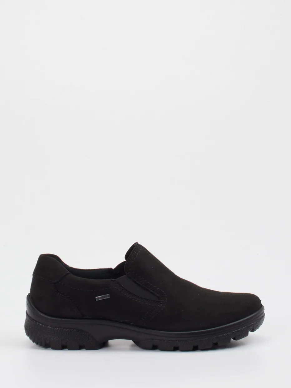 Minimalistisches Design trifft Outdoor-Komfort.Ara präsentiert einen Damen-Slipper, der Funktionalität und Schlichtheit stilvoll kombiniert. Ob beim Spaziergang im Park oder im Alltag: Das wasser- und winddichte Obermaterial aus samtig angeschliffenem Veloursleder schützt zuverlässig vor Nässe. Der Schuh zeigt sich in klassischem Schwarz mit matter Oberfläche, elastischen Einsätzen und betont reduzierter Silhouette. Eine rutschfeste Profilsohle sowie die High Soft-Innensohle sorgen für stabilen, komfortablen Halt. Das dezente Markenbadge und Ton-in-Ton-Nähte unterstreichen den „Quiet Luxury“-Charakter dieses Modells. Lässt sich ideal zu Komfort-Jeans und legeren Jacken kombinieren. Verlässlicher Komfort von Ara – puristisch, wetterfest und zeitlos tragbar.