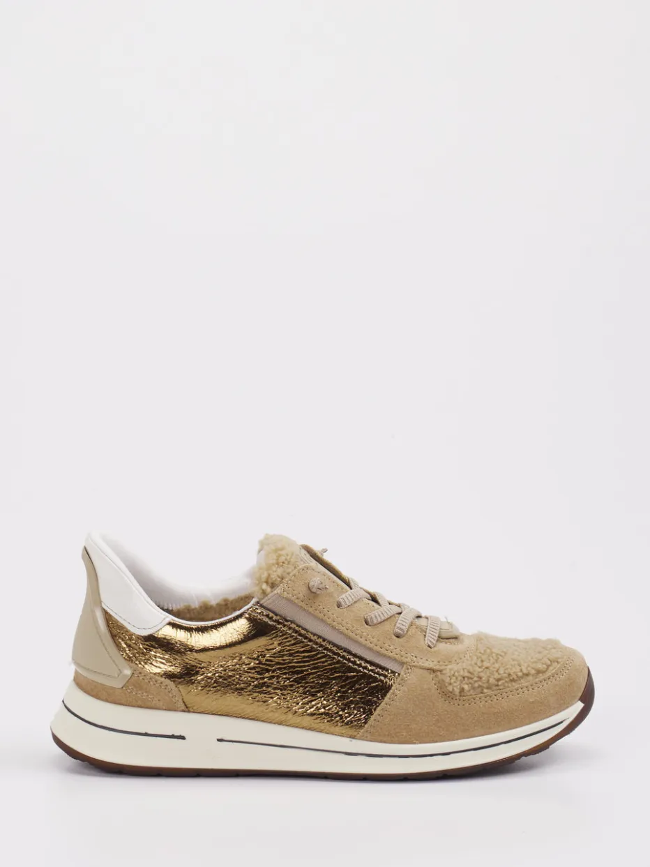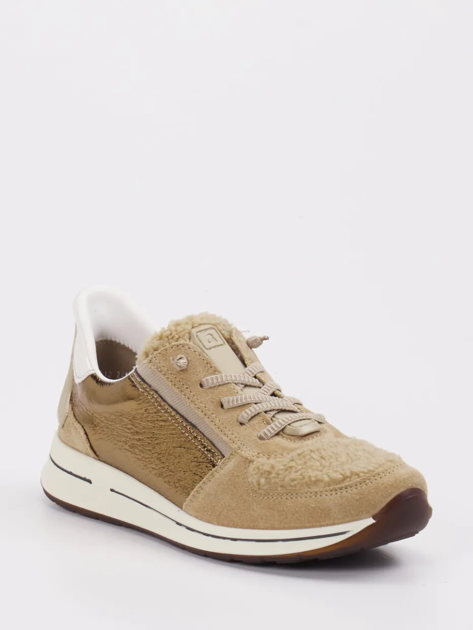 Der Damen-Sneaker von Ara überzeugt in funktioneller Bequemschuh-Qualität und modischer Streetwear-Optik. Dank des soften Obermaterials aus Veloursleder, Metallic-Kunstleder und Teddy-Textil bietet der Schuh ein interessantes Spiel aus Texturen. Eyecatcher wie der seitliche Zierreißverschluss und glänzende Einsätze akzentuieren den beigegoldenen Farbton. Die flexible Gummisohle mit Logo-Profil und das Teddy-Textilfutter sorgen für angenehmen Gehkomfort – auch an kühleren Tagen. Stylisch wird’s durch die abgerundete Silhouette und die weiße Kontrastsohle mit Streifendetail. Ideal zu Steppjacke und Metallic-Accessoires – für einen herbstlichen Cozy-Style mit urbaner Note.