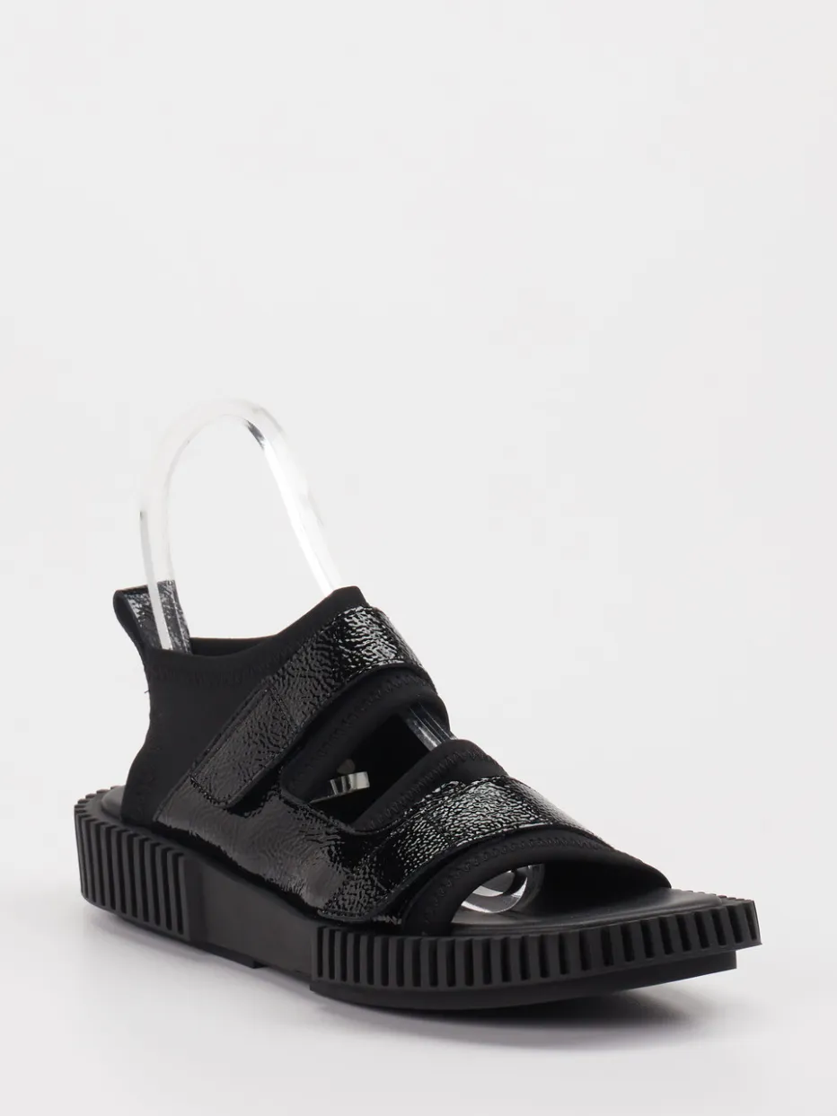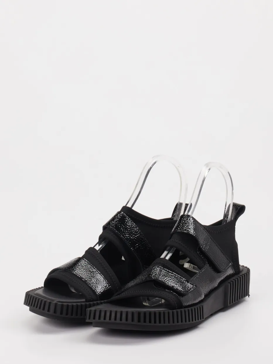 Diese schwarze Klettsandale vereint glänzendes Lackleder mit neoprengepolstertem Komfort und trifft durch die strukturierte Plateausohle den aktuellen Chunky-Trend.