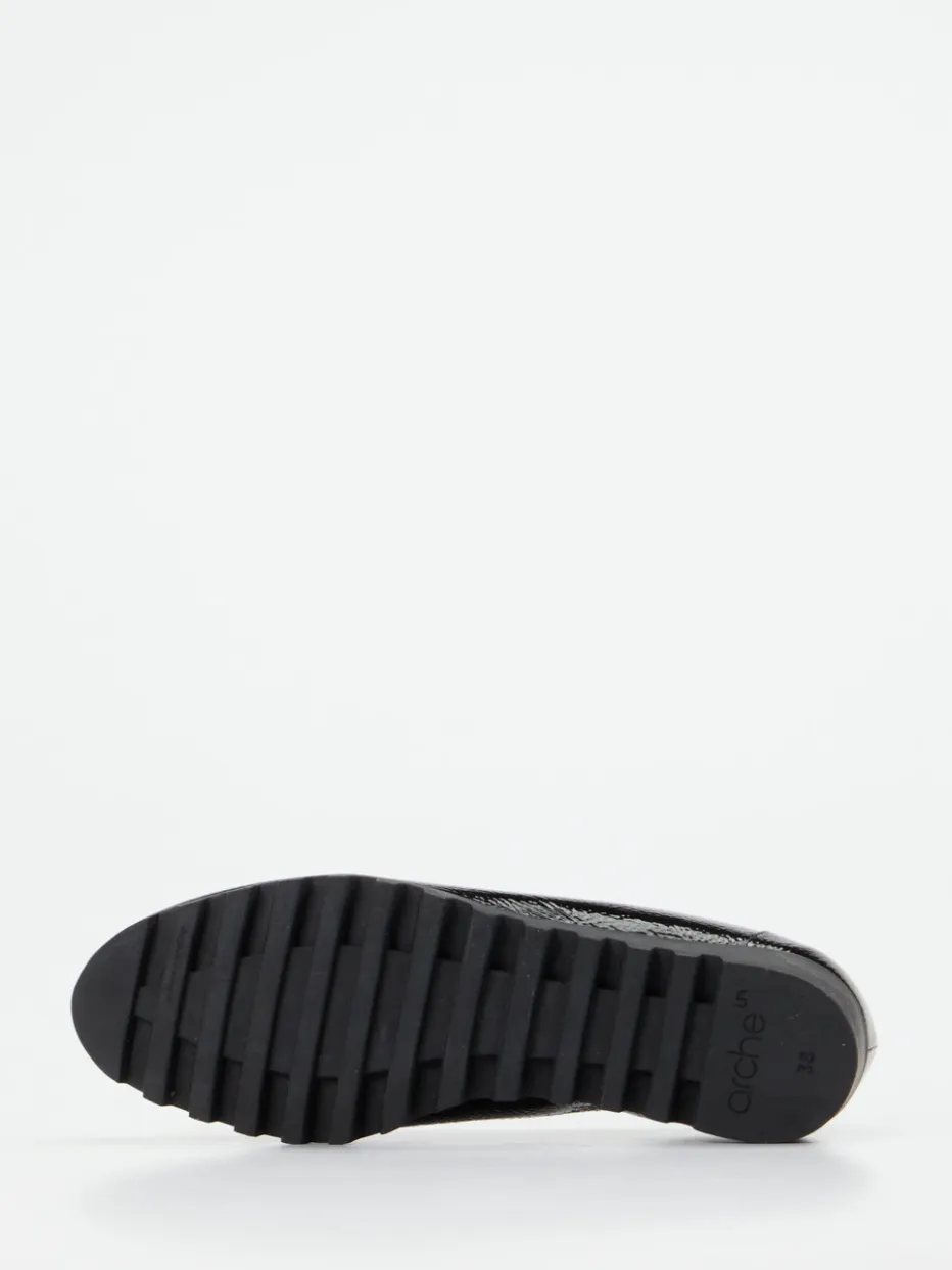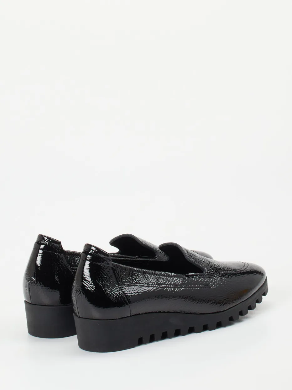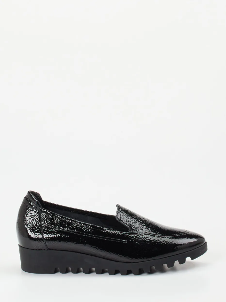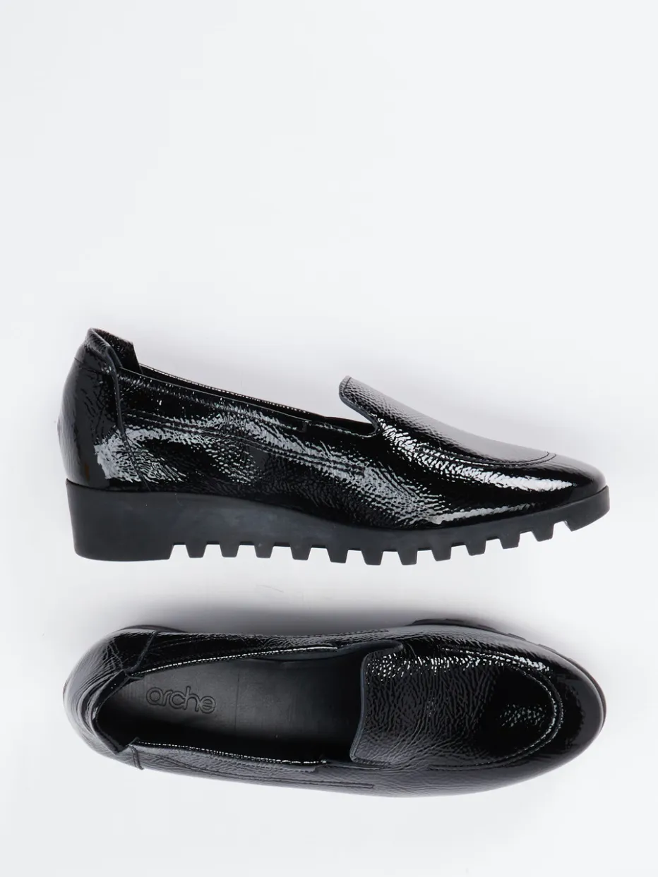 Der elegante Slipper von Arche kombiniert glänzendes Lackleder mit einer flexiblen Keilsohle für stilbewusste Alltagssituationen. Minimalismus trifft auf Tragekomfort und hochwertige Verarbeitung.