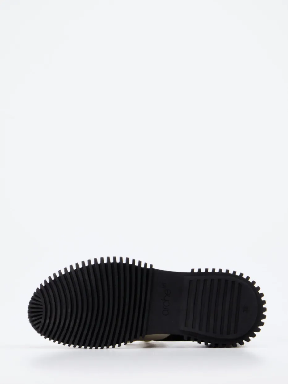 Stil trifft Komfort in moderner Form. Arche bringt mit diesem Sneaker ein Statement-Piece für die Freizeit auf den Punkt. Ideal für sommerliche City-Touren oder entspannte Urlaubstage überzeugt der Sneaker durch sein hochwertiges Hirsch-/Elchleder in genarbter Optik. In Beige gehalten und mit schwarzen sowie weißen Akzenten versehen, entsteht ein spannender Color-Blocking-Effekt. Die flache, kompakte Silhouette sowie die betonte Gummiprofilsohle mit 3,5 cm Absatzhöhe greifen aktuelle Streetwear- und Chunky-Trends auf. Asymmetrische Schnürung und Zuglasche an der Ferse sorgen für sportliche Details. Gut kombinierbar mit entspannten Casual-Outfits in neutralen Tönen. Markentypisch steht Arche für stilvollen Komfort mit avantgardistischer Note.