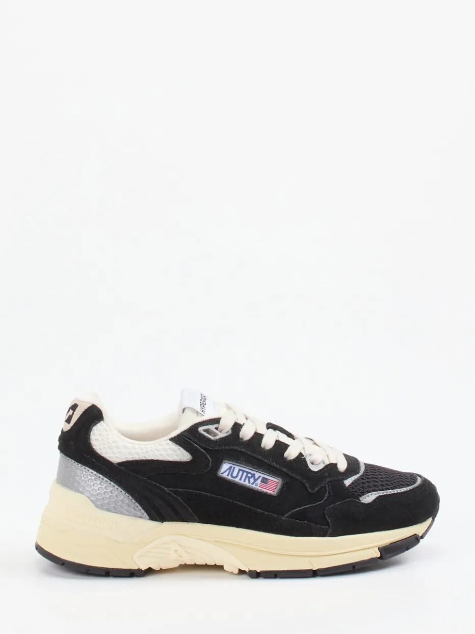 Urbane Dynamik im Retro-Look. Die Marke Autry präsentiert mit dem Sneaker Hyperway ein modisches Highlight im Bereich Retro-Runner. Für ausgedehnte City-Walks oder dynamische Freizeitlooks bietet dieser Sneaker mit schwarzem Veloursleder und atmungsaktivem Mesh-Komfort idealen Tragekomfort. Die klassische Silhouette mit reflektierendem Fersenbesatz, Kontrastnähten und silberfarbenem Detail punktet mit Vintage-Akzenten. Der gepolsterte Schaftrand, die dämpfende Chunky-Gummisohle und die verstärkte Ferse ergänzen das Design funktional. Streetwear-Einflüsse und 90s-Vibes werden souverän umgesetzt. Ideal zu Cropped-Jeans oder sportiven Techwear-Looks. Markentypisch vereint Autry Komfort, Stil und metropolitane Lässigkeit.