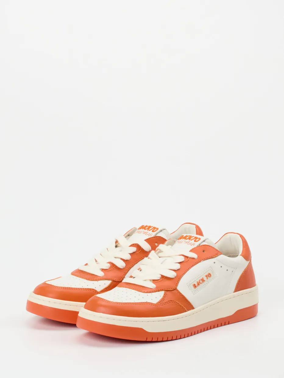 Dieser Low-Top-Sneaker verbindet weißes Glattleder mit orangeroten Overlays und vereint Retro-Basketball-Ästhetik mit modernem Komfort.