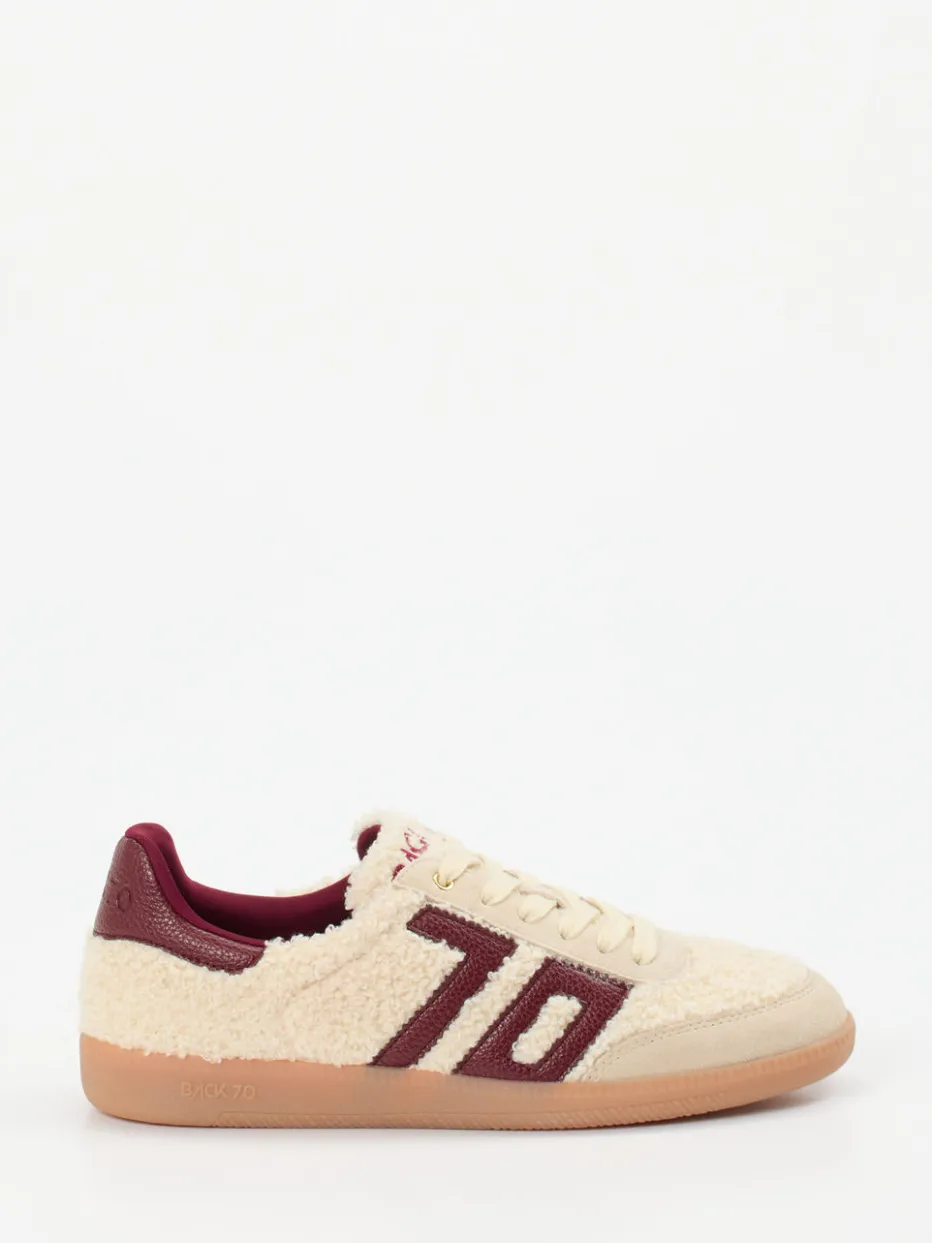 Retro trifft auf Kuschelkomfort. Back 70 präsentiert mit diesem Sneaker ein lässiges Unisex-Modell für entspannte Outfits. Ideal für entspannte Tage in der Stadt oder gemütliche Stunden zu Hause: Das beige Obermaterial kombiniert texturiertes Teddy-Textil mit Velour-Elementen und verleiht dem Schuh eine besonders weiche Haptik. Bordeauxrote Akzente, eine klassische Flachschnürung sowie eine tonale Logo-Stickerei unterstreichen den Retro-Charakter. Die profilierte Gummisohle sorgt für Trittsicherheit bei gleichbleibender Leichtigkeit. Perfekt zu Jogpants oder oversized Teddyjacken kombiniert. Ein Sneaker mit Cozy-Attitüde – für trendbewusste Casual-Looks mit Wohlfühlfaktor.